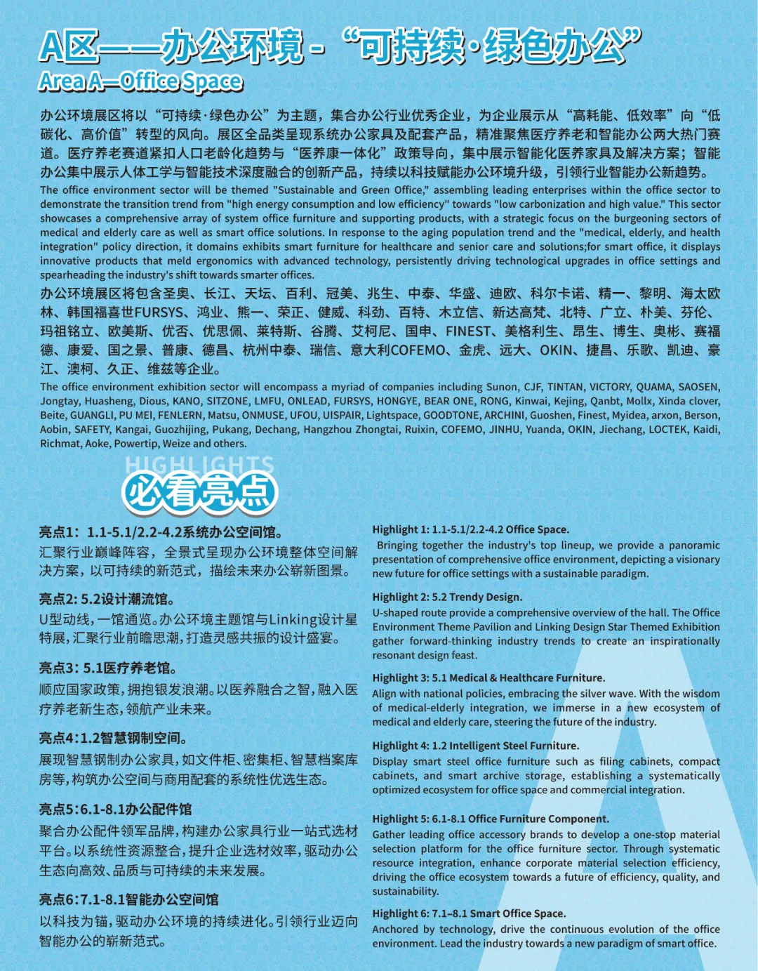 为构建行业可持续发展的根基,办公商用展以创新设计与循环理念为核心,系统打造全链条绿色办公样本。升级打造办公环境展区、办公坐具展区、公共商用展区三大展区,全面展示从材料革新、产品设计到空间应用的绿色实践,推动绿色办公从理念倡导迈向规模化、系统化落地。