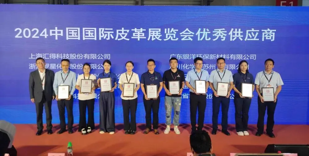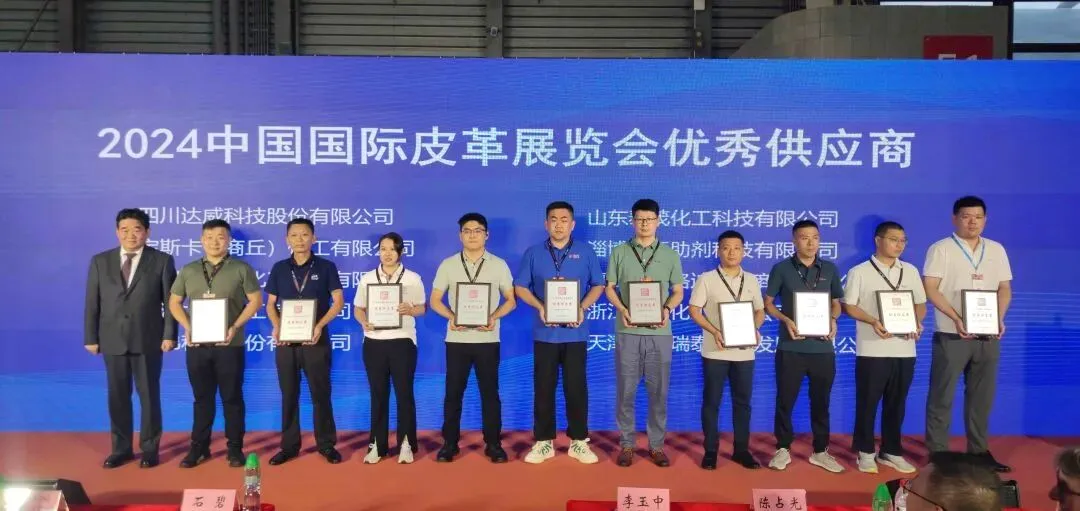 四川达威科技股份有限公司、宝斯卡(商丘)化工有限公司、广州市泉风化工科技有限公司、齐河力厚化工有限公司、兄弟科技股份有限公司、山东泰茂化工科技有限公司、淄博环亚助剂科技有限公司、镇江市普洛迪化工商贸有限公司、浙江盛汇化工有限公司、天津胜达瑞泰科技发展有限公司10家企业荣获“皮革化工类优秀供应商”