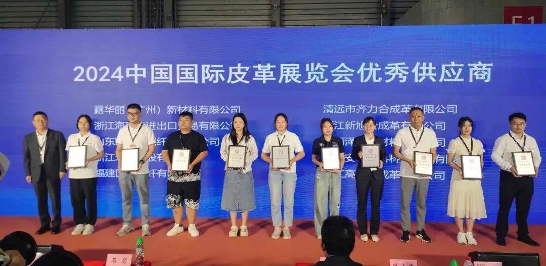 露华丽(广州)新材料有限公司、浙江海陆丰进出口贸易有限公司、山东凯泰超细纤维有限公司、浙江禾欣控股有限公司、福建国泰超纤有限公司、清远市齐力合成革有限公司、浙江新旭合成革有限公司、江西泽晞新材料有限公司、安徽安利材料科技股份有限公司、浙江高盛合成革有限公司10家企业荣获“合成革类优秀供应商”。