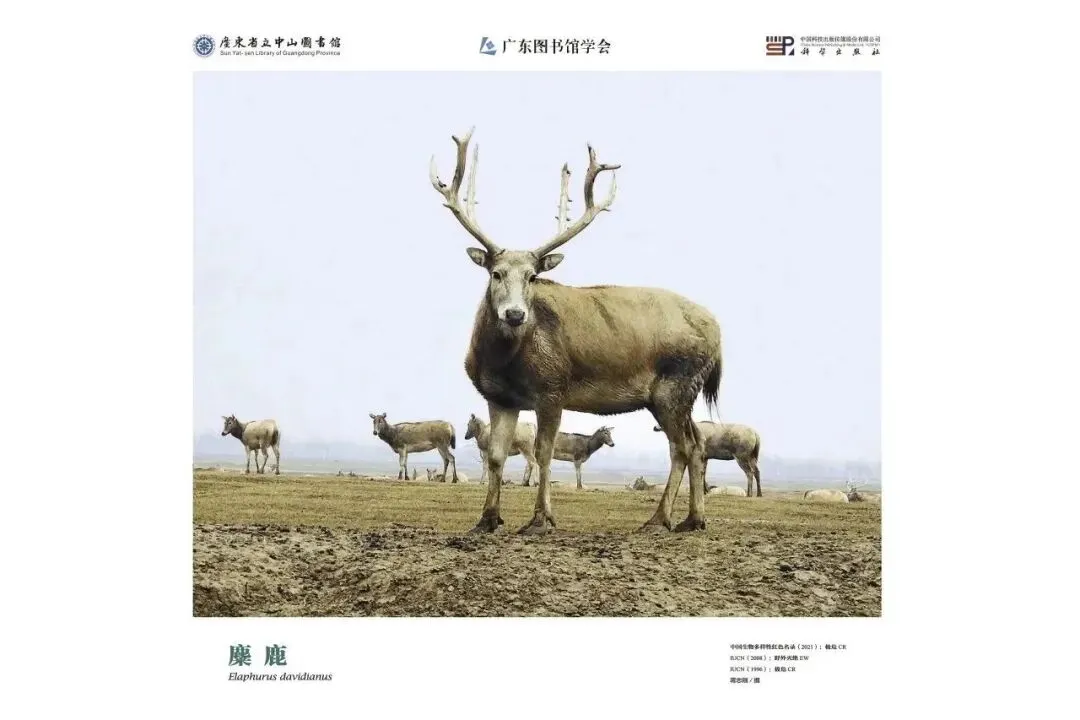 麋鹿曾经一度在中国野外灭绝。20 世纪初,中国最后一群麋鹿在北京南苑皇家猎苑毁于洪灾与战火。20 世纪80 年代从英国重新引入麋鹿,现在已引种到24 个省81 个地点,分别建立了江苏大丰、北京南苑、湖北天鹅洲等迁地保育种群 。2020 年,中国麋鹿种群数量达8,000 多头。目前,在江苏大丰黄海海滨和洞庭湖地区分别通过人工释放和自然野化建立了野化种群。因此麋鹿的濒危等级由“野外灭绝”降为“极危”。
