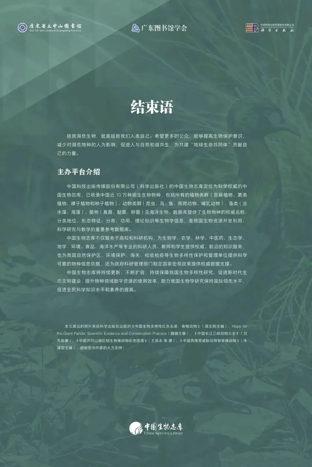 近日,由广东省立中山图书馆、广东图书馆学会、科学出版社主办、深圳晟屹科技有限公司协办,我校图书馆承办的《保护物种,共建地球生命共同体——中国生物志库濒危物种主题图片展》在我校南海北馆大厅展出,本次展览采用“线上+线下”同步开展的方式,欢迎各位读者前往观展。