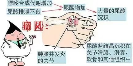 痛风主要是血尿酸水平升高导致尿酸盐沉积在关节,从而引发的一种疾病,沉积在关节内和关节周围的尿酸盐晶体可引起急性炎症发作,表现为剧烈的关节疼痛。患者常常在饮酒、食海鲜、动物内脏等高嘌呤食物后突然发作,可在午夜或清晨被关节剧烈疼痛惊醒,在数小时内达到高峰。痛风早期,初发关节常常是第一跖趾关节,出现局部皮肤发红、紧绷、发亮、皮温升高、关节剧烈疼痛,急性发作可在数天至数周自行缓解进入间歇期,但如果不积极控制,多数病人发作会越来越频繁,病情也会越来越重,长期反复发作,常伴有痛风石形成。