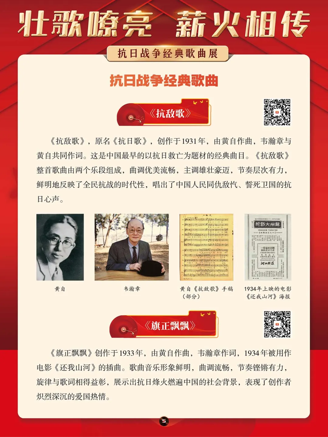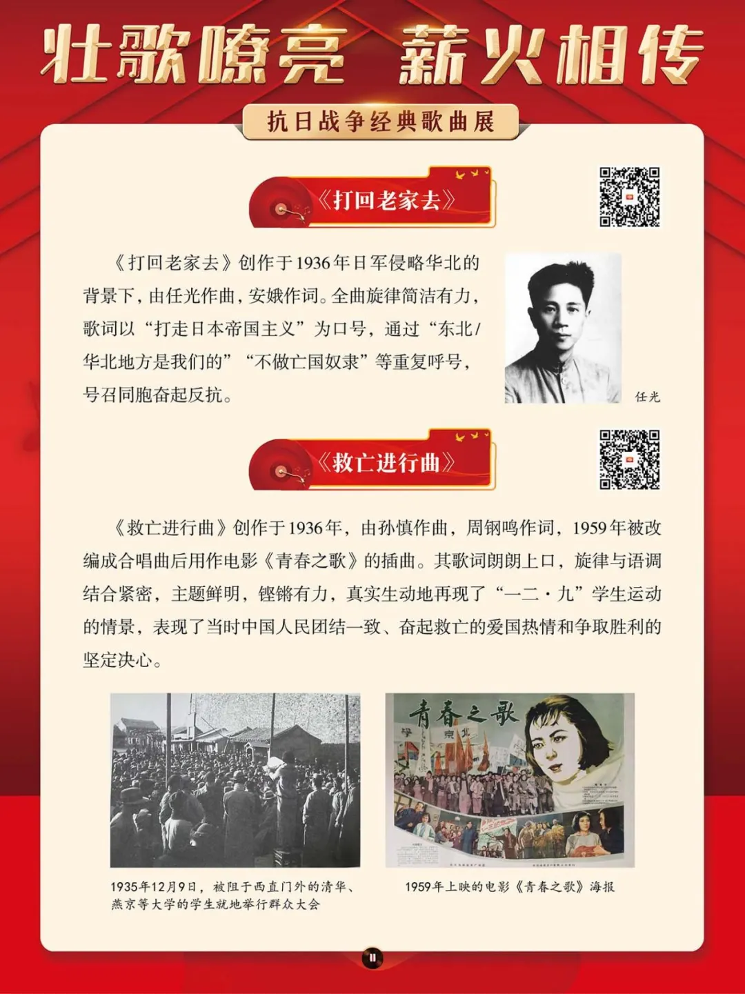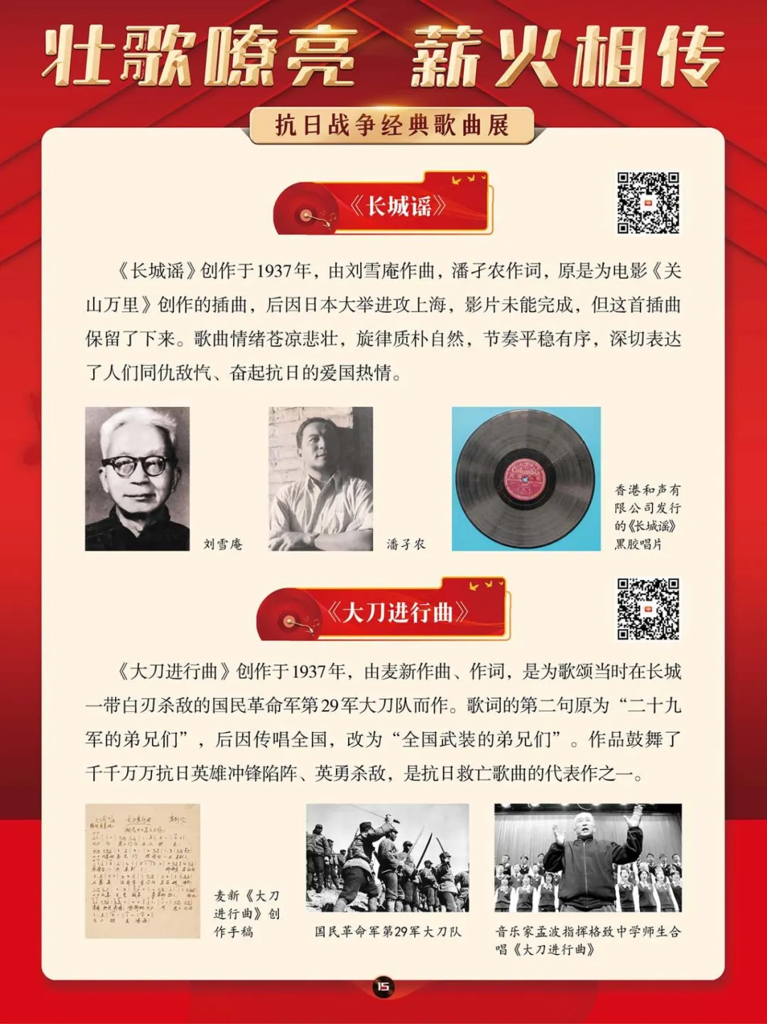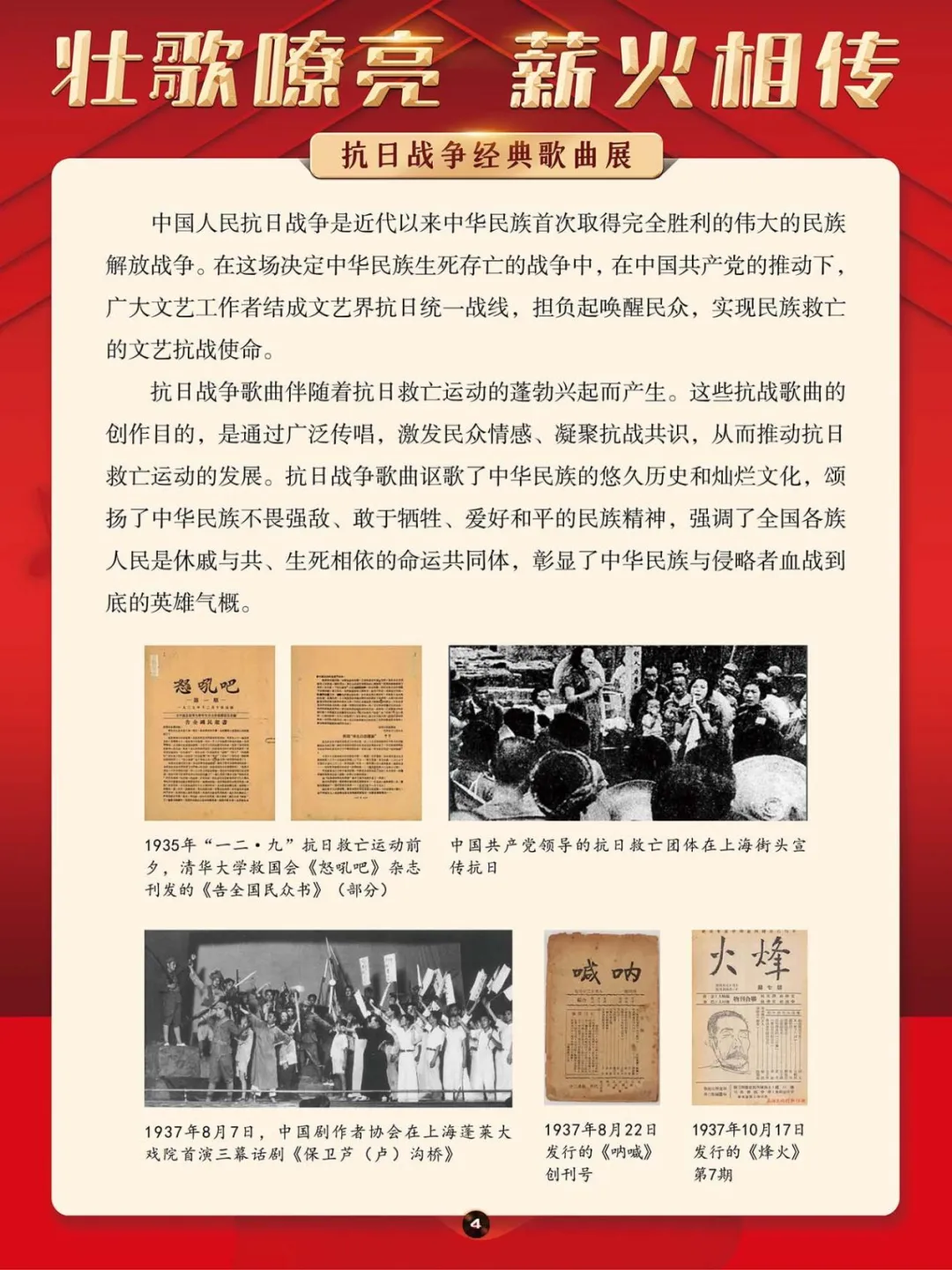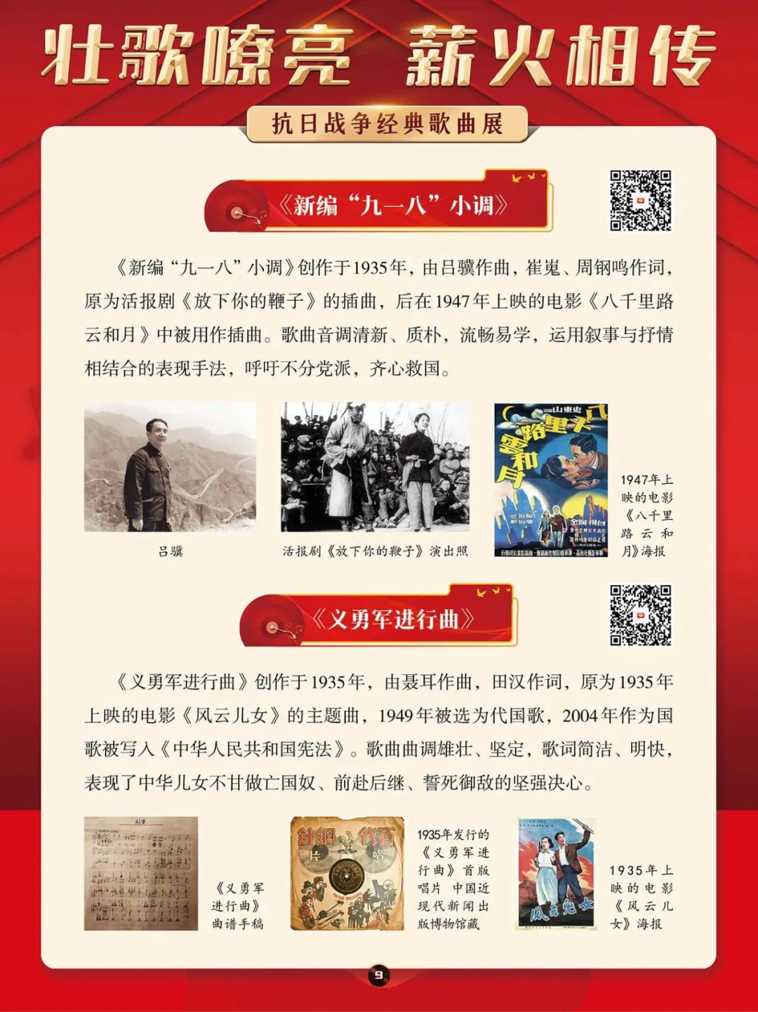 在那段艰苦卓绝的岁月里,一首首激昂澎湃的抗日战争歌曲,如同星星之火,点燃了亿万民众心中的希望与激情,它们是那个时代最直接、最有力、最深入人心的号角。本展将带大家一同回顾那些产生于抗日战争期间的歌曲,其中既有激情澎湃、催人奋进、积极昂扬的进行曲,也有“字字血、声声泪”地控诉敌人暴行的悲歌。这些歌曲伴随着抗日救亡运动的蓬勃兴起而诞生,并迅速传遍大江南北,成为凝聚民族精神、激发全民抗争的独特文化武器。它们以其朴实真挚的语言、慷慨激昂的曲调,深刻地反映了民族危亡的紧迫感和人民大众誓死抵抗的决心。