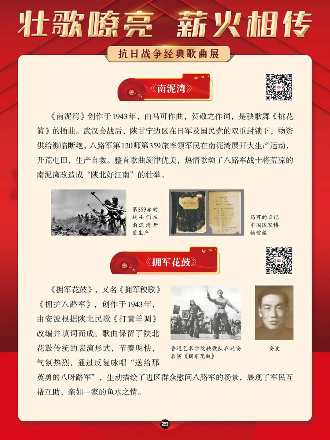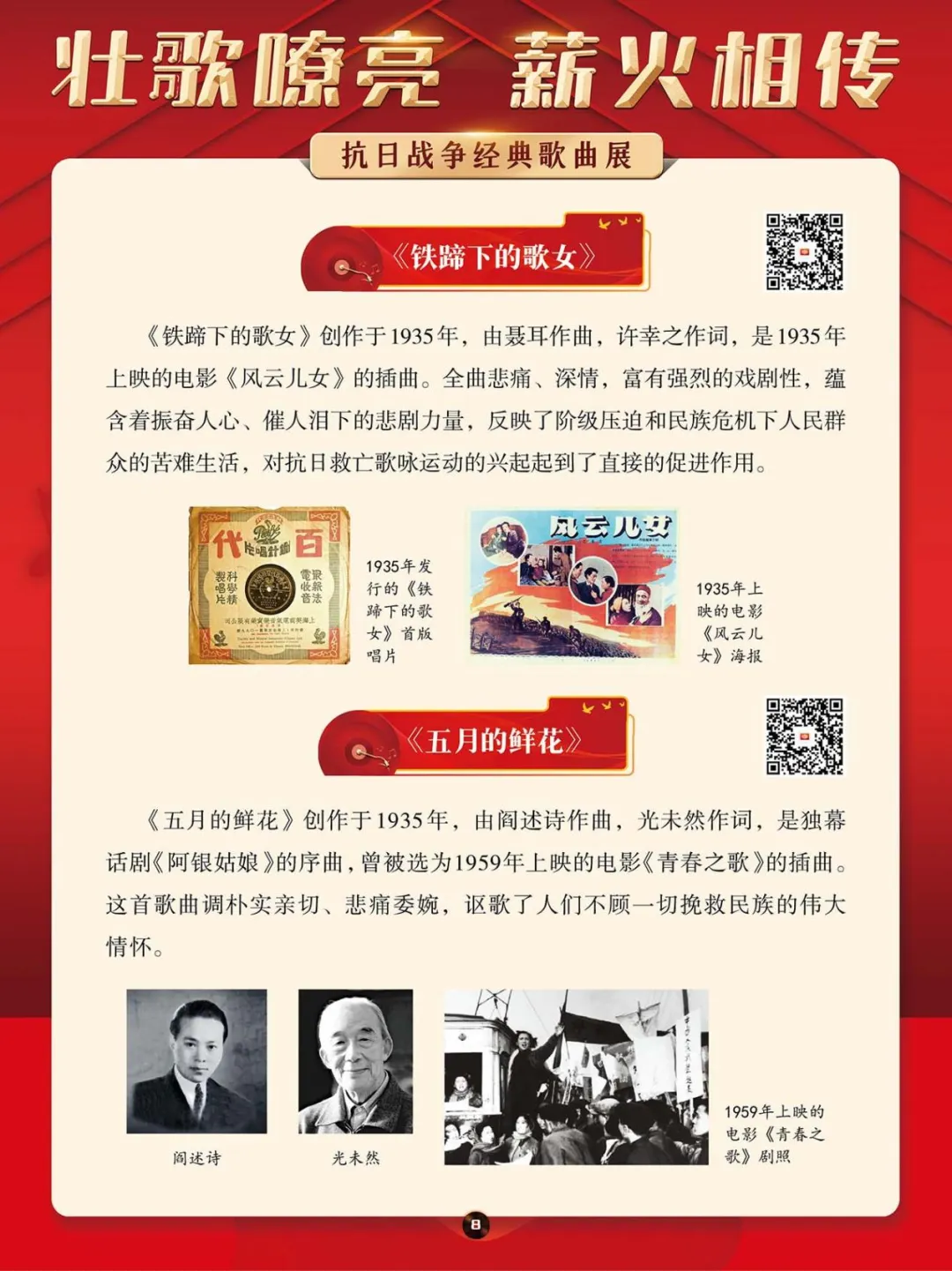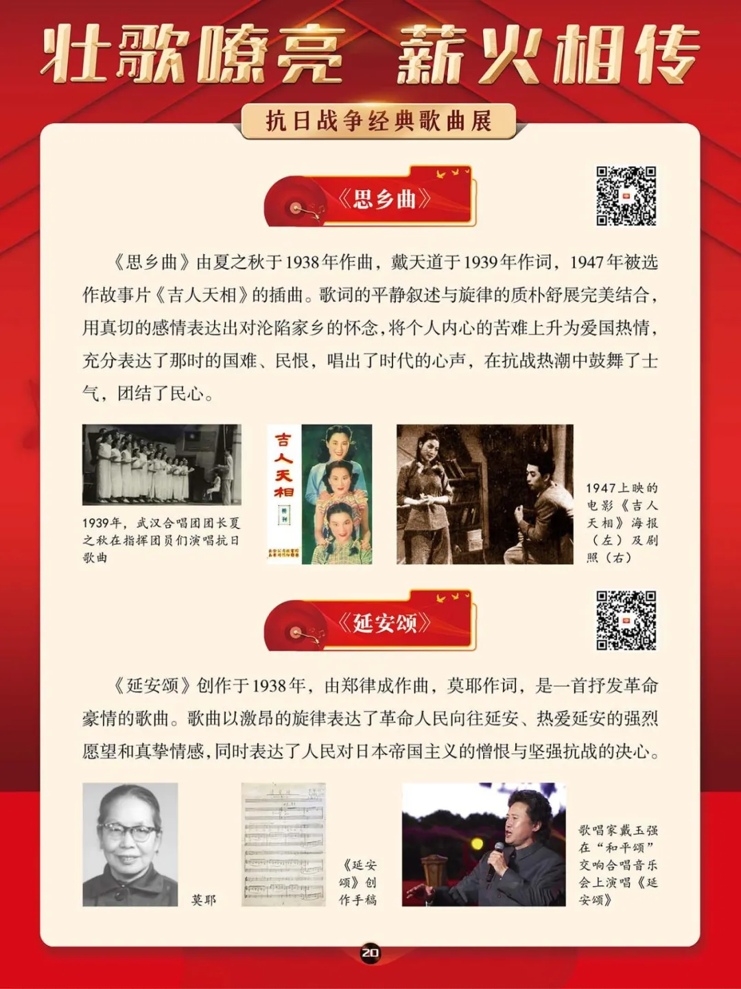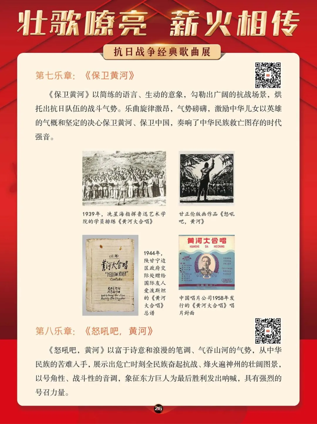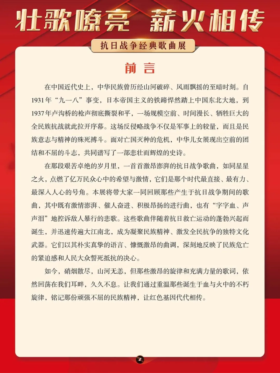 在那段艰苦卓绝的岁月里,一首首激昂澎湃的抗日战争歌曲,如同星星之火,点燃了亿万民众心中的希望与激情,它们是那个时代最直接、最有力、最深入人心的号角。本展将带大家一同回顾那些产生于抗日战争期间的歌曲,其中既有激情澎湃、催人奋进、积极昂扬的进行曲,也有“字字血、声声泪”地控诉敌人暴行的悲歌。这些歌曲伴随着抗日救亡运动的蓬勃兴起而诞生,并迅速传遍大江南北,成为凝聚民族精神、激发全民抗争的独特文化武器。它们以其朴实真挚的语言、慷慨激昂的曲调,深刻地反映了民族危亡的紧迫感和人民大众誓死抵抗的决心。