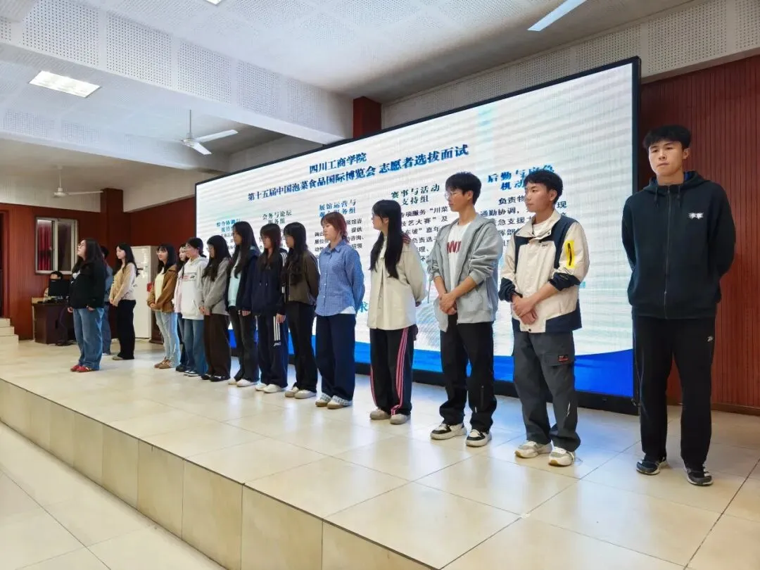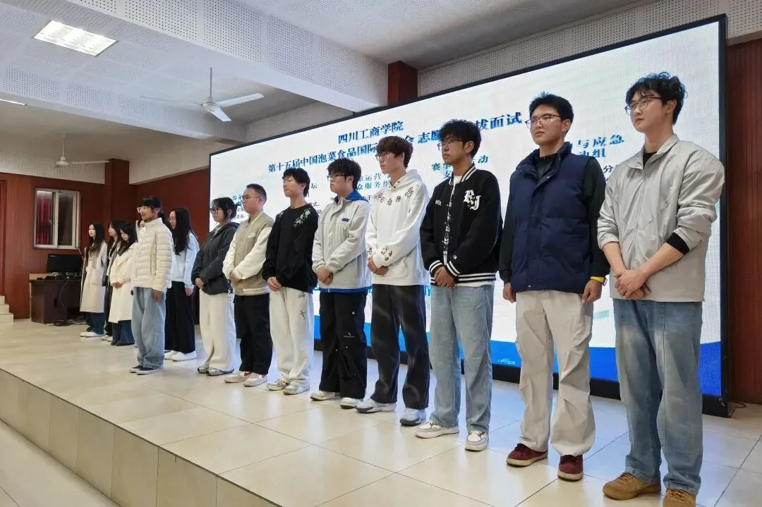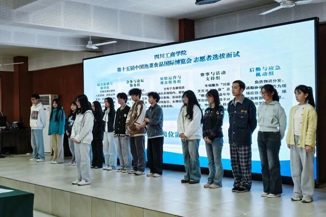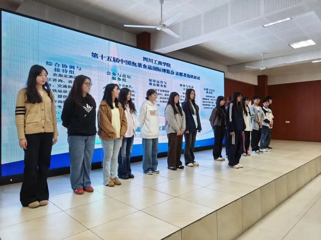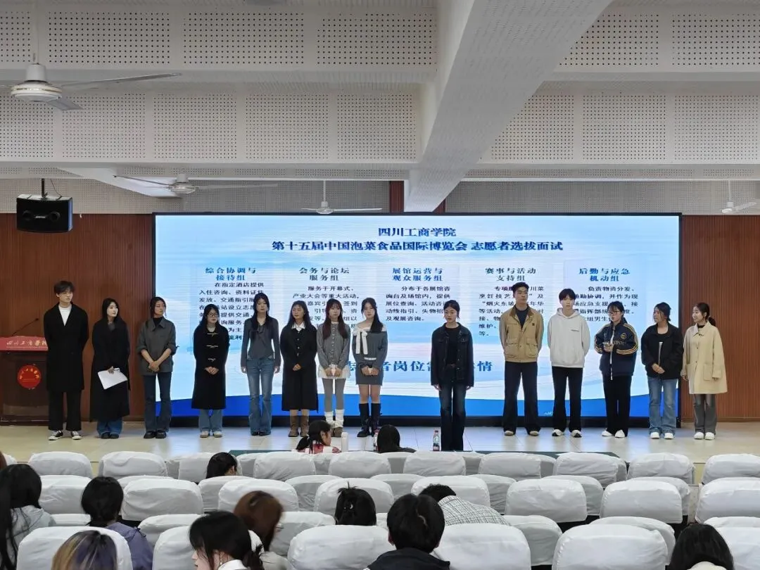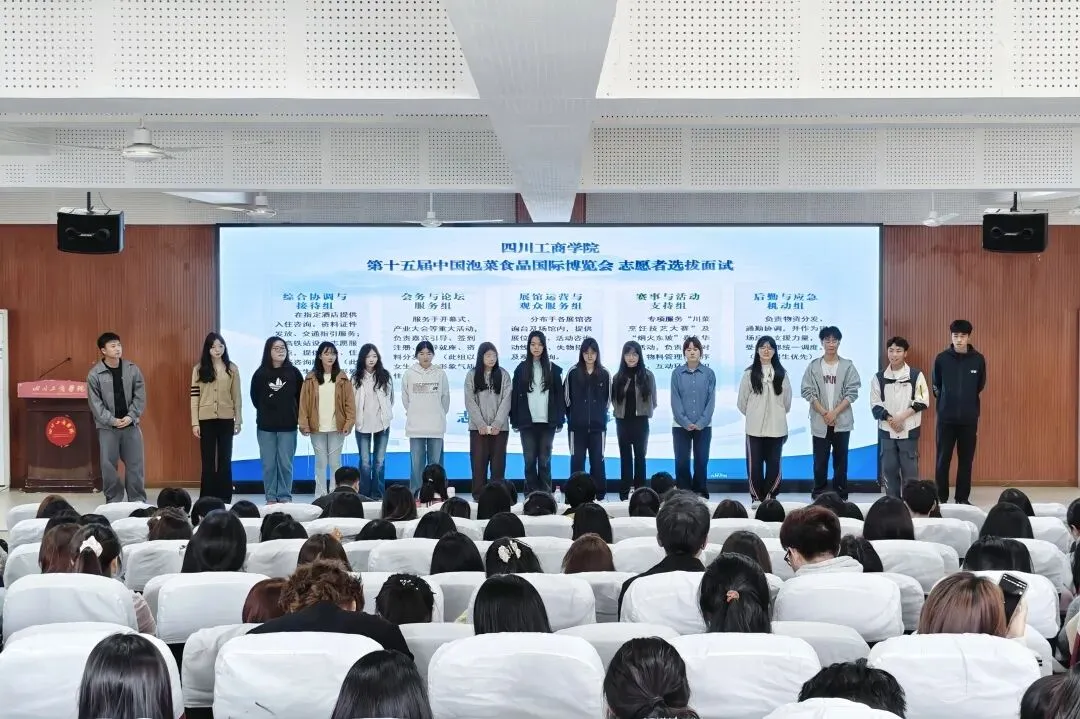 第十五届中国泡菜食品国际博览会即将开幕,为做好各项服务保障工作,在校团委的组织动员下,各二级学院分团委全力配合,广大同学踊跃报名,400余名同学进入初选环节,于2026年3月26日下午在学校图书馆学术报告厅参加初选面试。面试官由东坡区团区委学工部负责人郭玲莉、学校团委副书记李玥、学校学工部教育科负责人罗恩勤、团区委学工部工作人员胡蝶、学校团委工作人员伍潇担任。