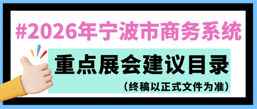 (来源:宁波市商务委)2026年宁波市商务系统重点展会建议目录(终稿以正式文件为准) https://czsb.ningbochina.com/news/view.html?id=77&lang=cn入选宁波市重点展会目录,爱客展览的组展项目将获得更多资源与推广。我们将充分发挥重点展会的平台优势,整合海内外优质行业资源,为参展企业搭建贸易对接桥梁,对接全球采购商,助力企业实现良好的参展效益。依托重点展会目录的导向,企业参展不仅能提升品牌公信力,还能在市场拓展、资源对接等方面获得切实支持。参与重点展会,有助于企业更精准地对接当地采购商、经销商与合作伙伴,快速打开目标市场;借助背书与行业聚焦效应,企业可有效提升品牌在海外市场的认知度与影响力。同时,重点展会汇聚行业前沿信息与市场趋势,参展企业能够及时了解海外需求变化、竞品动态和技术走向,为产品优化、市场布局提供参考。重点展会具备一定的行业权威性,企业参与其中,既能区别于普通商业展会的参展企业,也能快速获得海外采购商、行业伙伴的信任,有效提升品牌在目标市场的认可度,减少品牌海外推广的沟通成本。