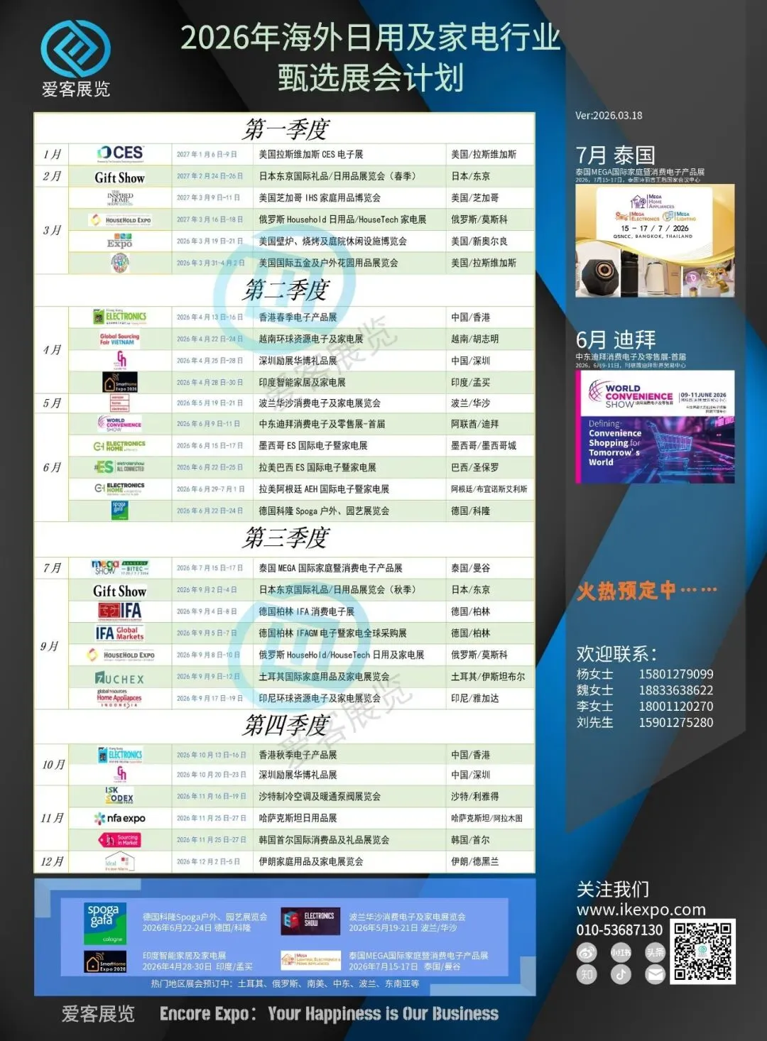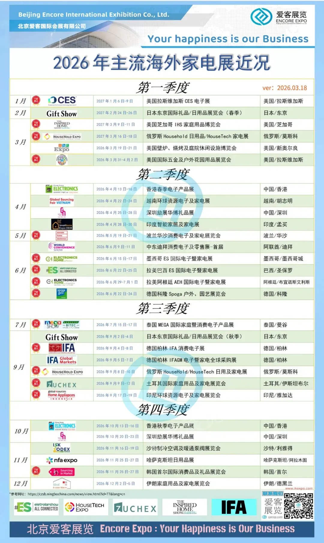 重点展会依托优质资源,参展企业有望突破投入大量人力物力进行市场调研和客户挖掘的瓶颈,即可面对面对接意向客户,现场洽谈合作,降低海外市场开拓的时间成本和人力成本。针对入选重点目录的展会,相关部门通常会推出参展补贴、费用减免等扶持政策(具体以官方正式文件为准),尤其对中小微企业而言,可有效减轻展位费、搭建费、差旅费等参展成本,让企业以更低的投入,获得更优质的参展体验和市场回报。重点展会汇聚行业上下游优质企业、前沿技术与资源,参展企业可现场了解海外市场的需求变化、产品流行趋势、竞品发展动态,为企业产品迭代、市场布局、战略调整提供参考。重点展会不仅是商贸对接的平台,更是行业交流的桥梁,企业可借助展会契机,与同行业优秀企业、产业链上下游伙伴深度交流,探讨合作模式、共享行业资源,拓展海外合作圈层,以期达成产业链协同、资源互补的长期合作,为企业长远发展助力。爱客展览致力于打造覆盖消费电子、家电、家居用品等多个热门领域的展会体系,贴合各类企业的出海需求。往届展会吸引了大量海内外客商参与,为众多中国品牌开拓海外市场提供了优质渠道,每一场展会,都是企业展示产品、对接商机、拓展市场的重要平台。2026注定是忙碌而充实的一年,心怀阳光,步履不停。感谢选择爱客展览!#北京爱客展览 #EncoreExpo 愿继续助力各位,逆风破浪,开拓新局。期待与更多企业携手同行,共拓海外贸易市场,共筑品牌出海新未来。