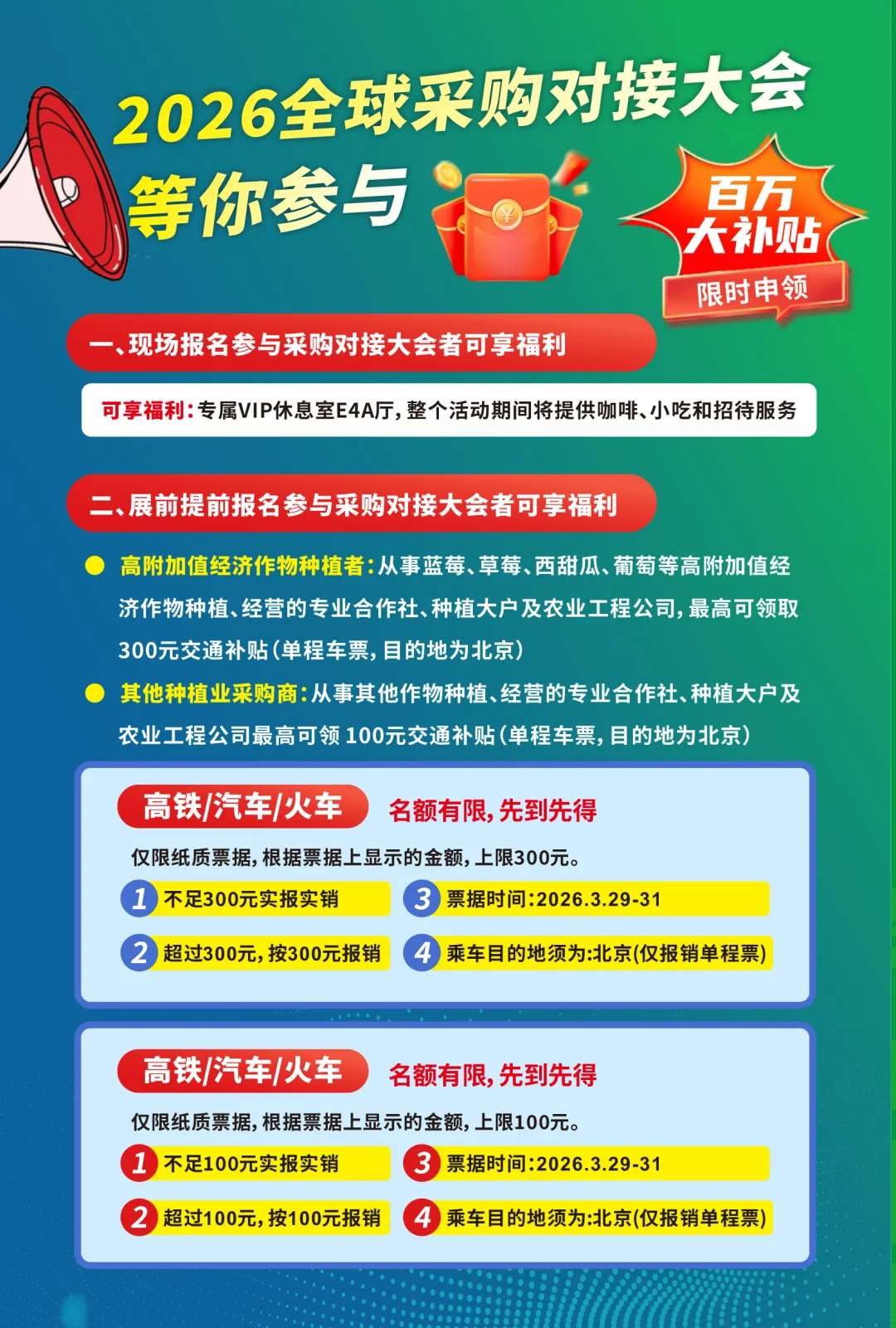 提前报名:高附加值经济作物种植者最高可领300元交通补贴,其他种植业采购商最高可领100元交通补贴(凭2026.3.29-31期间来京纸质票据报销)名额有限,先到先得。
