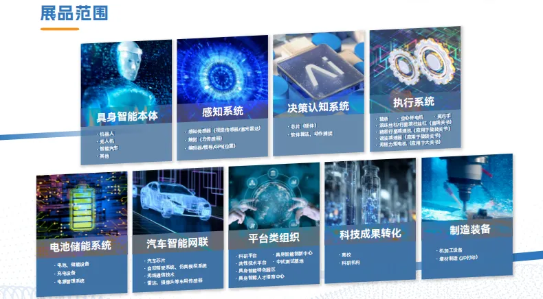 展会围绕产业链关键环节设置九大展区——具身智能本体、感知系统、决策认知系统、执行系统、电池储能系统、汽车智能网联、平台类组织、科技成果转化、制造装备,构建从技术研发到产业应用的完整展示体系。