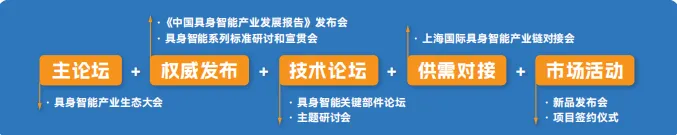 主论坛:2026具身智能产业生态大会、具身智能应用场景大会 《中国具身智能产业发展报告》发布会 具身智能系列标准研讨和宣贯会 上海国际具身智能产业链对接会 具身智能关键部件论坛 新技术新产品发布会 主题研讨会 项目签约仪式