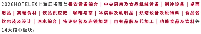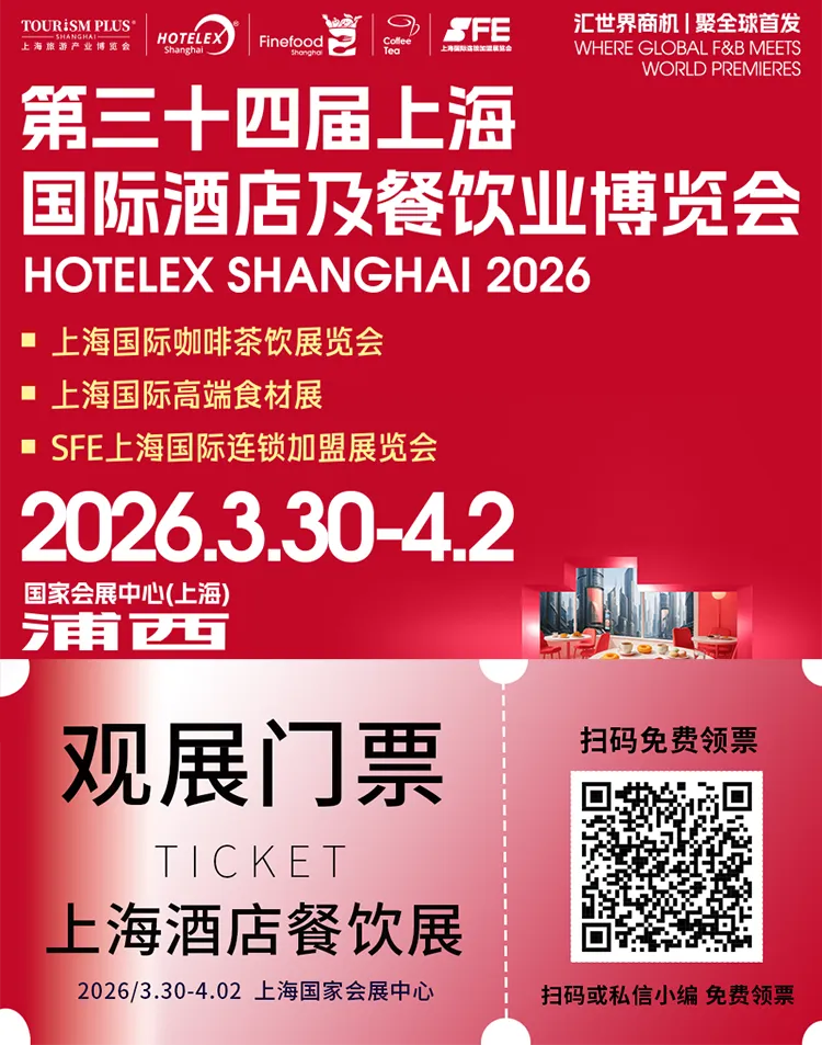 汇聚全球资源、展现行业前沿,2026年3月30日至4月2日相约国家会展中心(上海),共赴40万㎡的HOTELEX上海酒店及餐饮展,一站式满足产品采购、资源对接与学习交流需求。