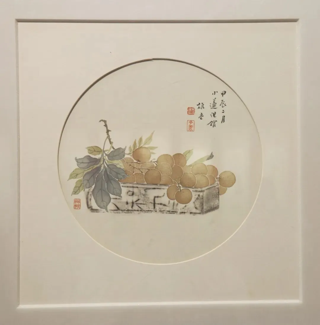 本次展览中,荔枝、芭蕉、木瓜等岭南嘉果跃然于笔墨刀石之间。艺术家吴汥涌以“诗书画印”为载体,巧妙地将地域物产转化为意蕴悠长的艺术符号。观其国画,一花一果、一枝一叶与觚、卣、尊等古器物相映成趣,寥寥数笔的落款,更显悠然自得的创作心境;品其书法,果名与咏果诗词融汇篆、隶、行、草等诸体,笔墨流转间尽显传统文化深厚底蕴;赏其篆刻,龙眼纹路、黄皮之形被精妙镌刻于金石之上,方寸之间匠心独运。这些作品不仅饱含对岭南风物的热忱礼赞,更传递出艺术家扎根乡土、以艺传情的文化自觉。