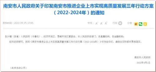 9月5日,南安市人民政府发布《南安市推进企业上市实现高质量发展三年行动方案(2022-2024年)》(以下简称《方案》)。《方案》总体目标为:到2024年末,力争实现新增上市挂牌企业10家以上。其中,重点任务将围绕石材、陶瓷、机械装备、水暖厨卫、电子信息、日用轻工等传统优势产业集群,每年筛选20家龙头、骨干企业,培育形成“专精特新后备方块”。