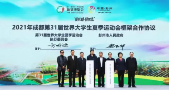 ▲大运会执委会与彭州市人民政府框架合作协议签约仪式