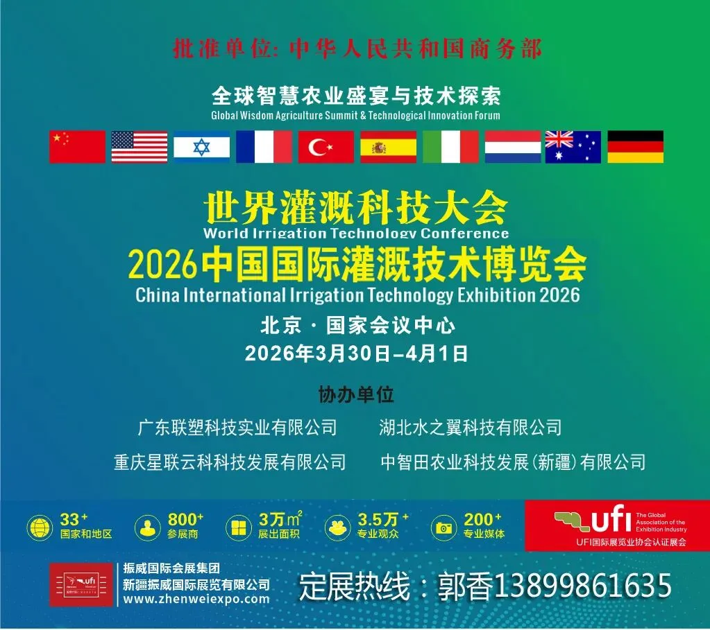 2026中国国际灌溉技术博览会暨世界灌溉科技大会将于3月30日-4月1日北京国家会议中心盛大开幕。同期举办2026现代设施农业大会、第12届北京国际智慧农业博览会、北京国际水利科技博览会,四展联动,汇聚300+国内外知名企业,覆盖60余个国家和地区。