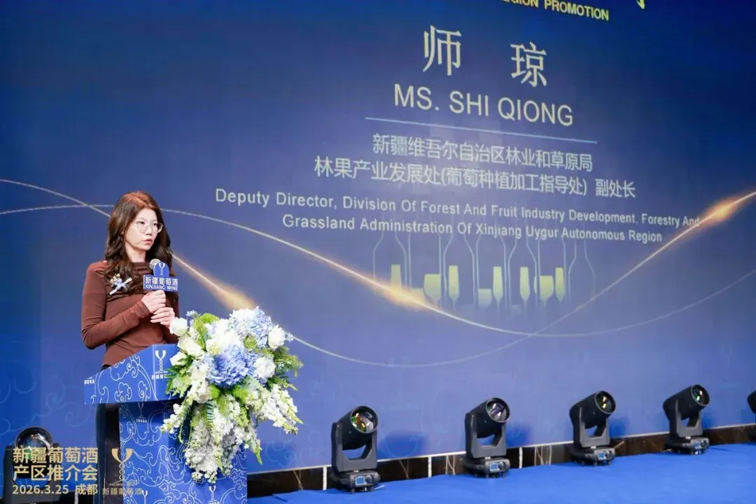 新疆维吾尔自治区林业和草原局林果产业发展处(葡萄种植加工指导处)副处长师琼作产区推介,从两千余年酿酒历史、全球黄金酿酒带的自然优势,到天山北麓、伊犁河谷、焉耆盆地、吐哈盆地四大核心产区和阿克苏慕萨莱思特色产区的产业格局、134家酒庄的集群发展成果,以及尼雅、天塞等本土品牌的市场影响力,让现场嘉宾对新疆葡萄酒有了更深刻的认知。