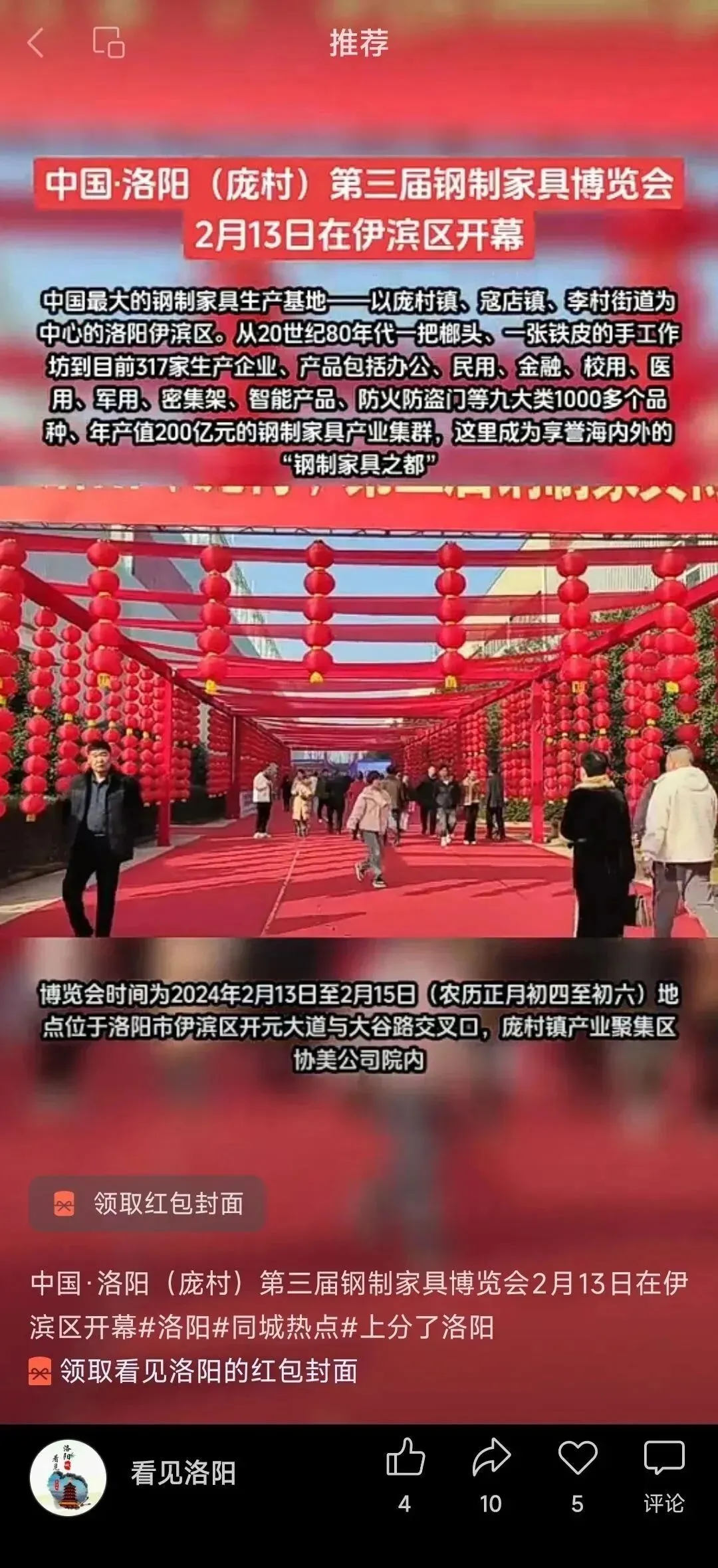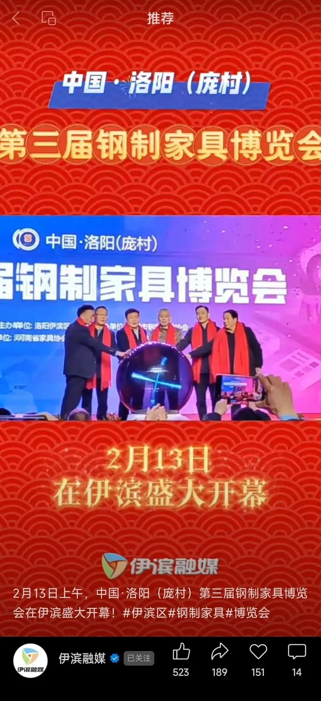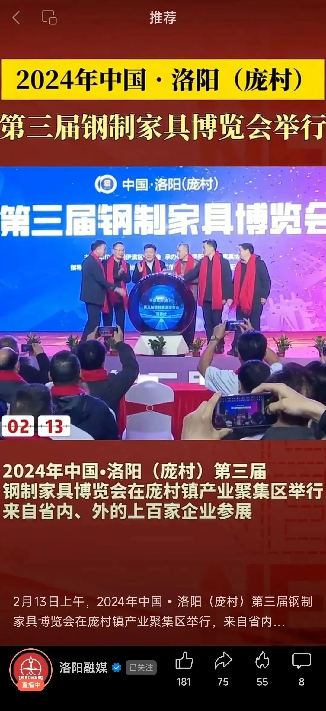 2月15日,洛阳(庞村)第三届钢制家具博览会胜利闭幕。本届博览会以“智能家居·创享生活”为主题,于2月13日至15日在伊滨区庞村镇成功举办,各项活动开展顺利、精彩圆满。此次活动由伊滨区管委会主办,由洛阳市钢制家具协会承办,河南省家具协会、洛阳市工信局、洛阳市科技局、洛阳市商务局为指导单位。本次博览会形成了以下成果和亮点。
