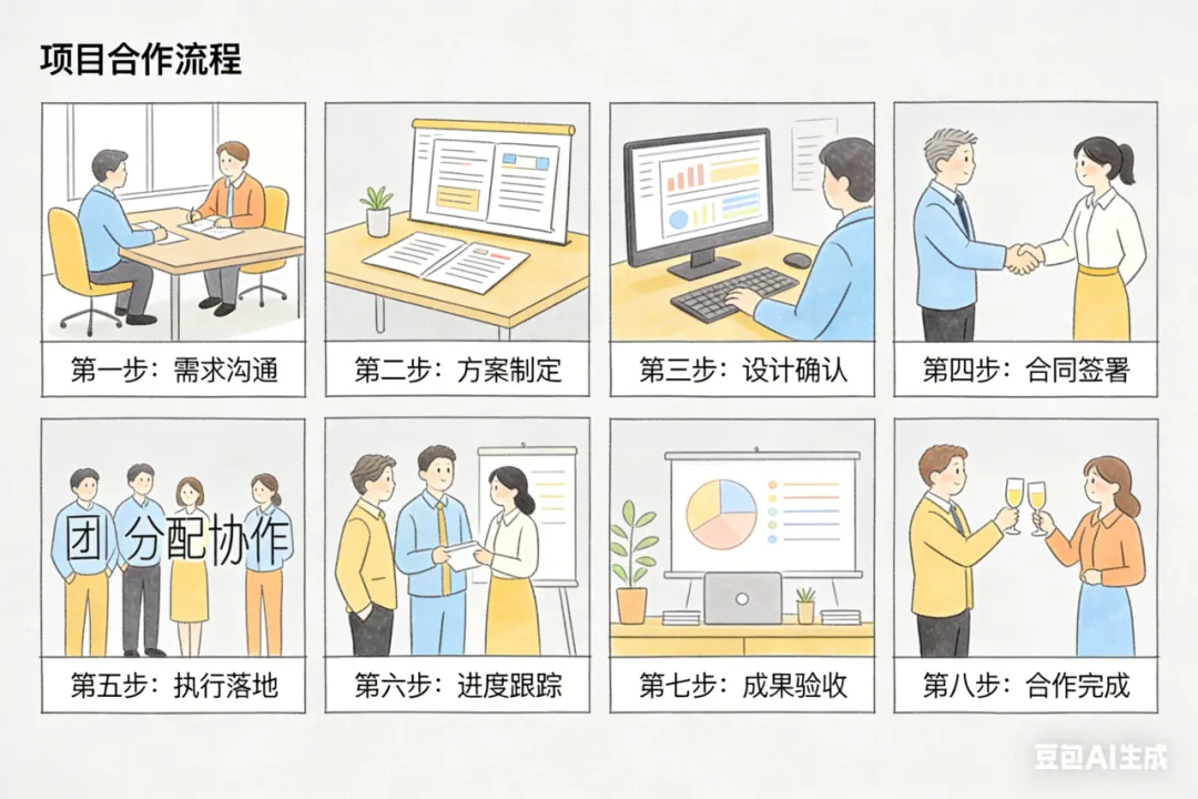 整个合作流程清晰可控,从前期评估到并网发电,全程有专业机构对接,企业只需配合提供相关资料,无需费心繁琐事宜,具体步骤如下: