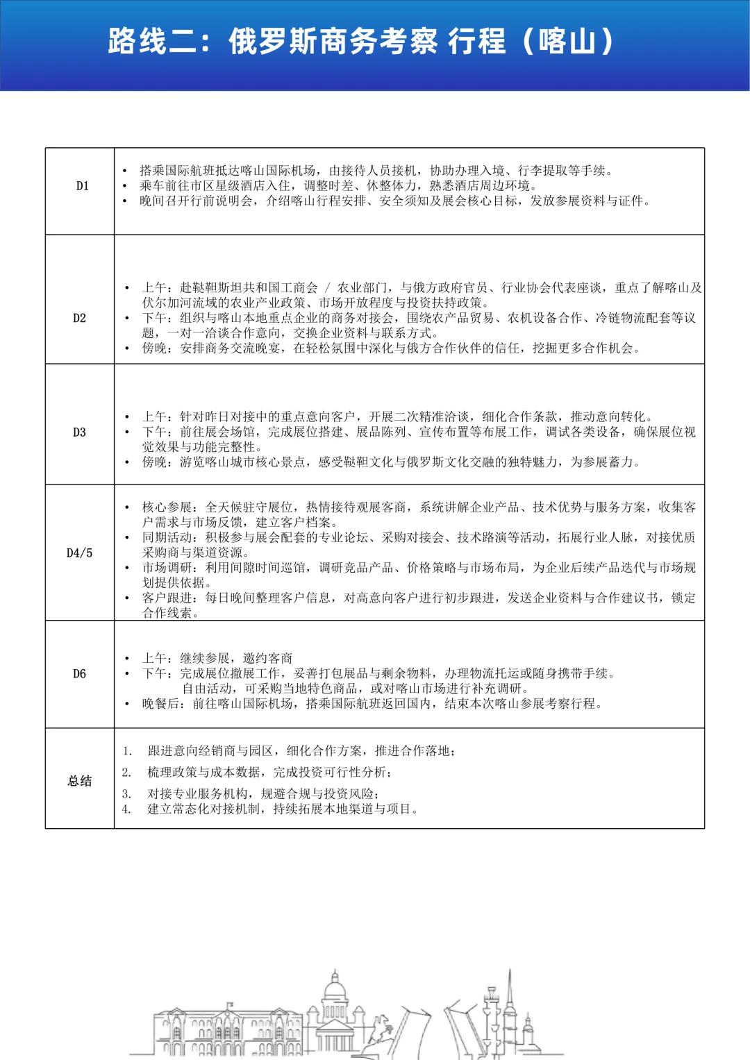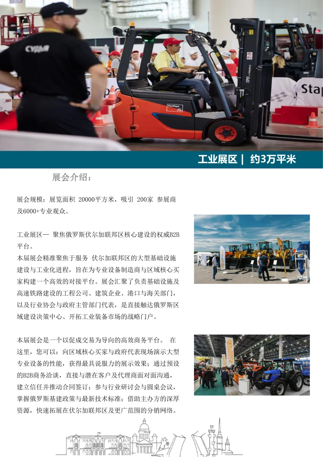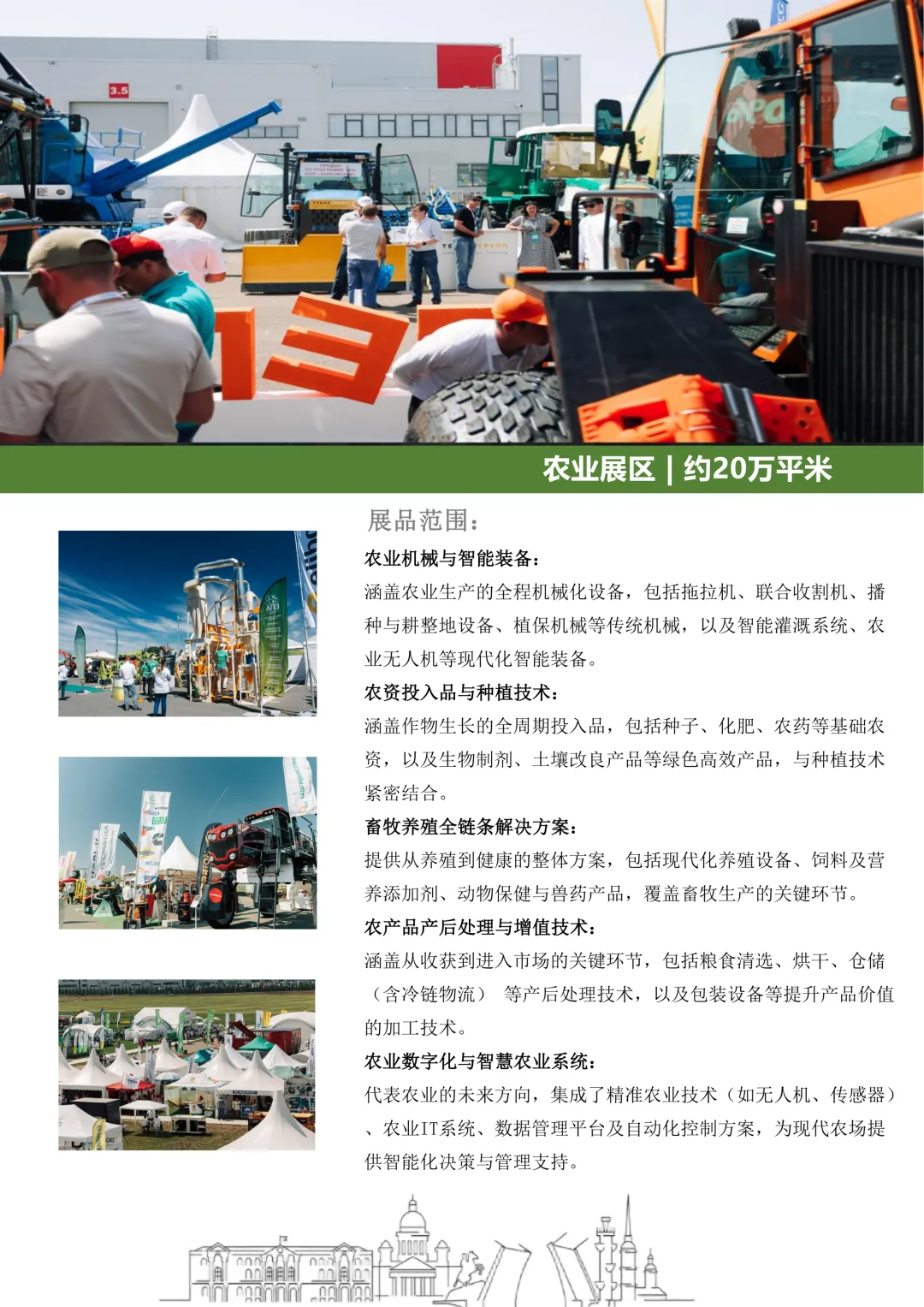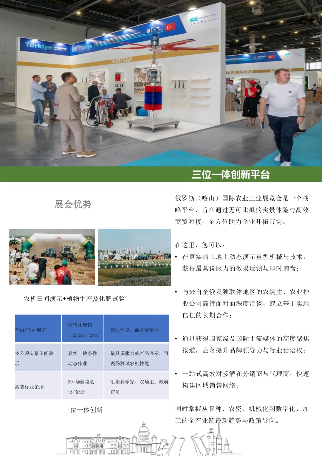 喀山——俄罗斯“第三首都”,金砖国家领导人峰会举办地,是连接欧亚的交通枢纽,更是俄罗斯经济最发达的工业农业重镇——鞑靼斯坦共和国的首府。✅ 农业综合实力全俄第三✅ 畜牧业、牛奶产量全国第一✅ 中俄合作机制成熟,设有中国驻喀山总领事馆✅ 2024年金砖峰会成功举办,城市国际影响力空前时间:2026年7月8日-10日地点:俄罗斯喀山国际会展中心规模:48公顷展区 | 400+参展商 | 15000+专业观众 | 28国国际访客三大亮点融合一体:1️⃣ 室内外展览:现代化展馆 + 48公顷实景田间演示2️⃣ 动态农机演示:真实土地条件下测试设备性能3️⃣ 高端行业论坛:20+场圆桌会议,汇聚政府、科研、企业高层展区分布丨农业展区(约20万平米)农业机械与智能装备农资投入品与种植技术畜牧养殖全链条解决方案农产品产后处理与增值技术农业数字化与智慧农业系统低空经济专区:植保无人机、多光谱遥感、精准农业技术展区分布丨工业展区(约3万平米)道路工程、建筑工程设备农业工业设备、石油工业设备木材采伐、市政公用、物流仓储设备专用运输车辆、特种服务与技术支持两大考察路线,量身定制:? 路线一:莫斯科 + 喀山(9天)政府对接:俄罗斯农业部、工贸部门、工商会企业考察:农业集团、科技园区、龙头企业论坛参会:中俄农业合作高峰论坛文化体验:红场、克里姆林宫、喀山古城? 路线二:喀山深度(6天)政府部门座谈:鞑靼斯坦工商会、农业部门本地企业对接:农产品、农机、冷链、电商全程参展:布展、接待、撤展一站式服务城市考察:喀山克里姆林宫、鲍曼步行街参展价值✅ 真实场景演示:48公顷田间实地演示,客户亲眼见证设备性能✅ 精准对接买家:与全俄及独联体地区农场主、农业控股公司高管面对面✅ 品牌曝光提升:国家级媒体聚焦报道,提升行业影响力✅ 一站式考察服务:从签证、物流、翻译到对接,全程无忧往届回顾:中国驻喀山总领事向波先生亲临中国展区,对山东、河南企业代表团的参展成果给予高度评价,中俄双方在农业、畜牧、机械等领域达成多项初步合作意向。立即报名,抢占先机!
