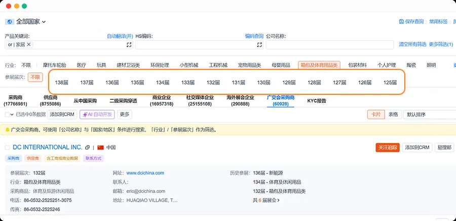 客户挖掘:基于海量贸易数据与AI智能推荐,企业可直接锁定广交会活跃采购商,了解其采购规律、产品偏好,实现精准触达。