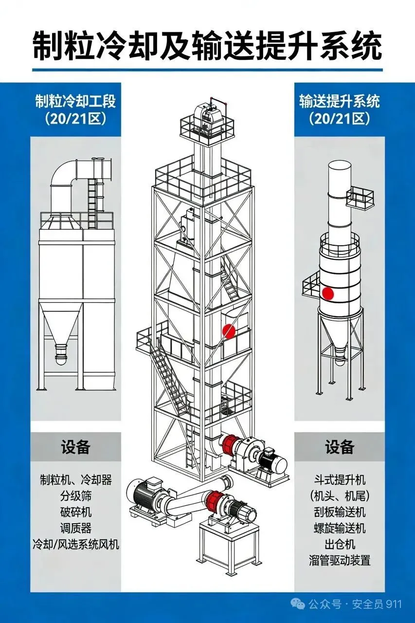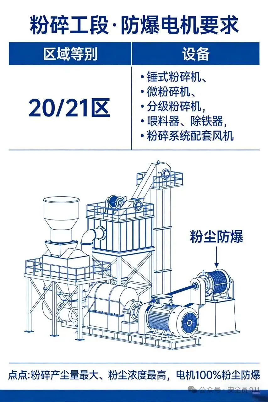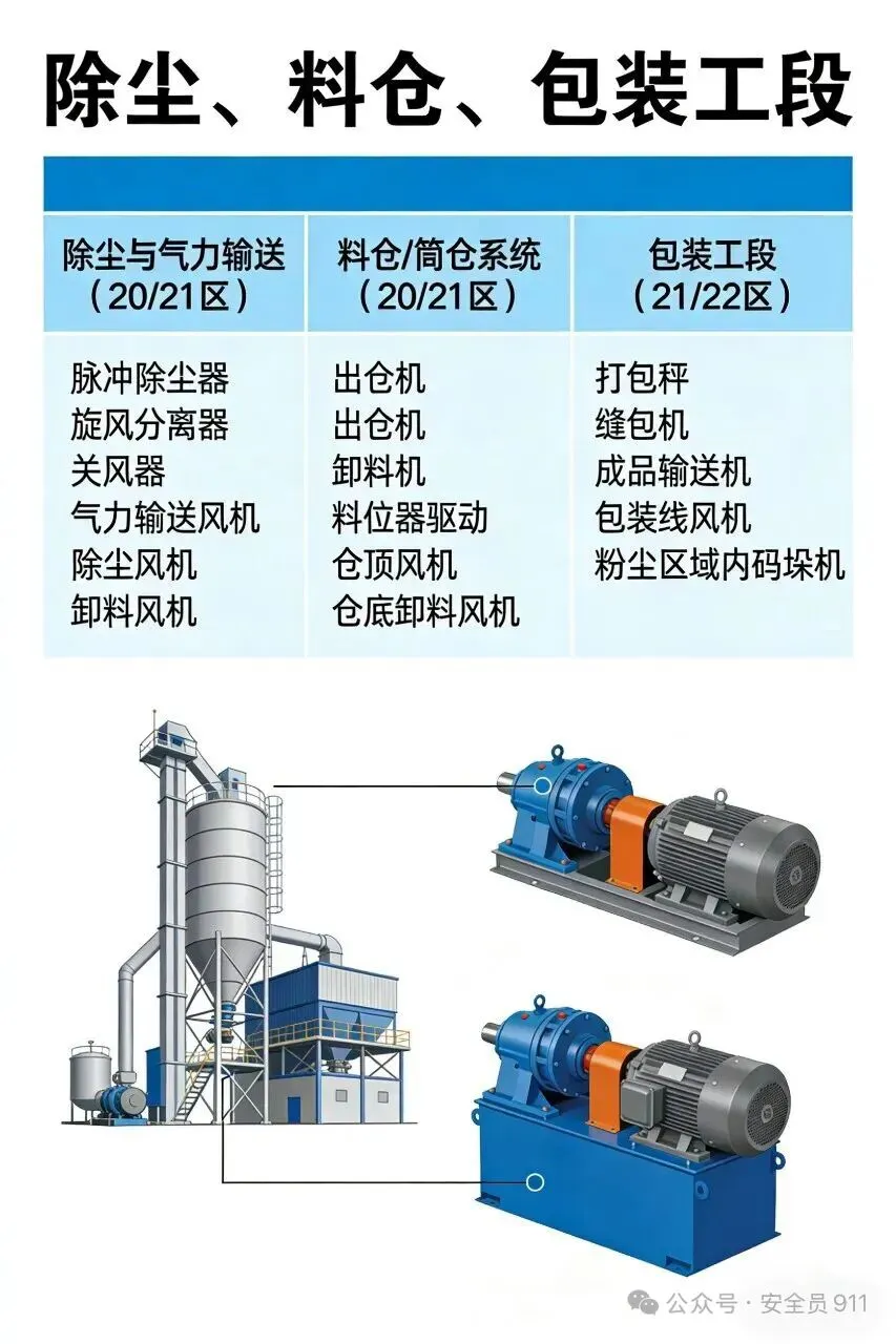 按GB 19081-2025《饲料加工系统粉尘防爆安全规范》,20区、21区、22区内所有驱动电机必须使用粉尘防爆电机(Ex tD)。以下按工段/设备清单归纳汇总。