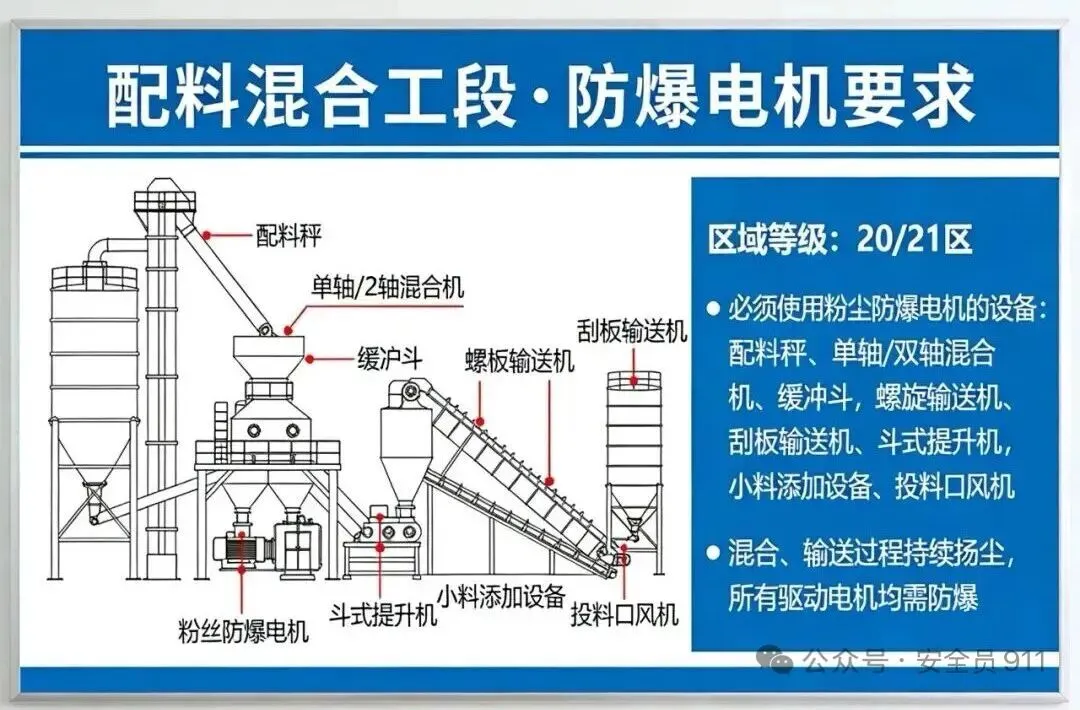 总之,饲料生产现场所有产尘、积尘、粉尘云可能出现的区域(20/21/22区),其驱动电机100%必须用粉尘防爆电机(Ex tD),无例外。