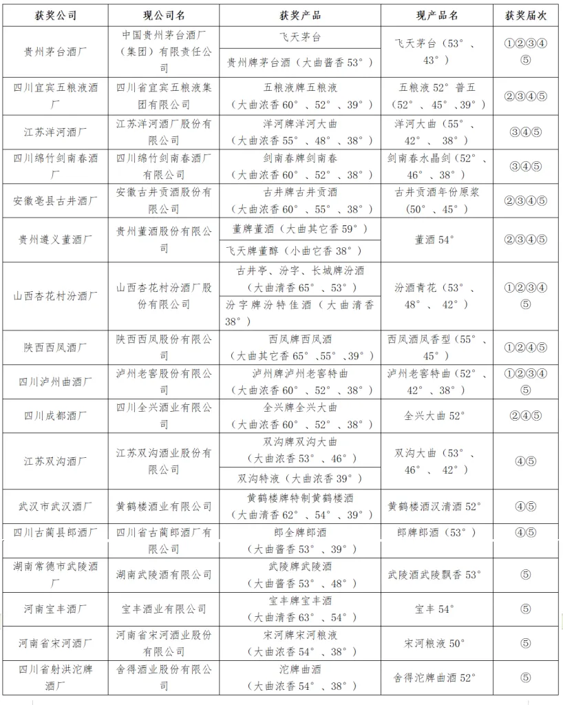 表 5 全国历届评酒会获奖名单