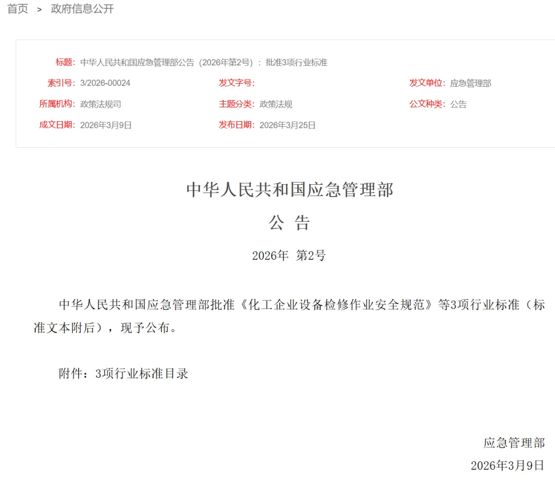2026年3月15日,国家应急管理部正式发布三项化工安全新标准:AQ3026-2026《危险化学品企业安全风险分级管控和隐患排查治理双重预防机制建设导则》、AQ3067-2026《危险化学品重大危险源辨识》、AQ3072-2026《危险化学品企业特殊作业安全规范》。新标准将于2026年9月1日正式实施,替代原有旧标。