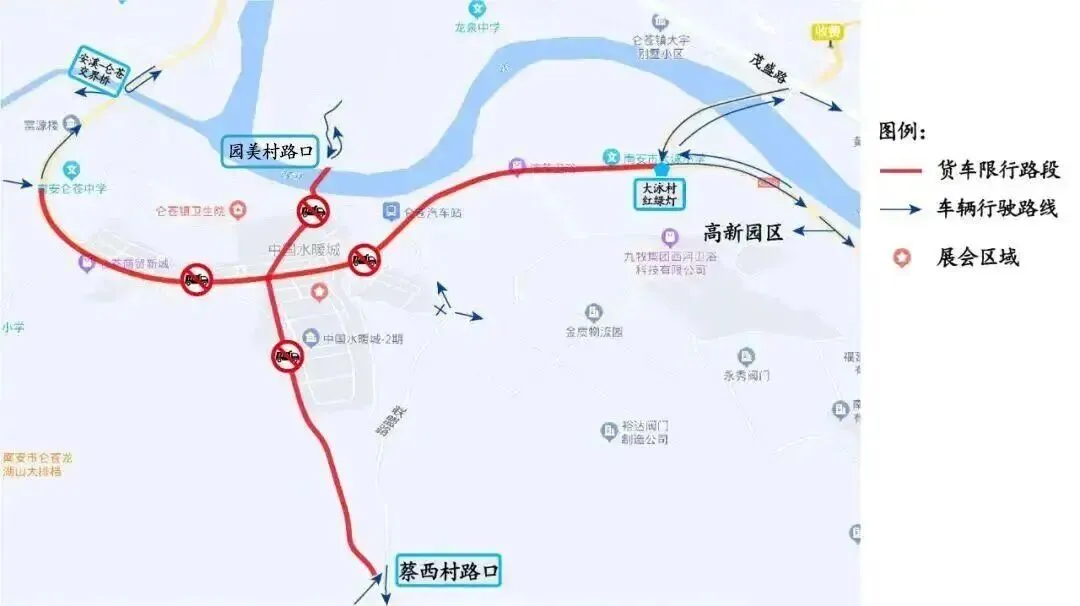 禁行路段: 南北大道至蔡西村路口、仑苍安溪桥头至大泳村高速口红绿灯