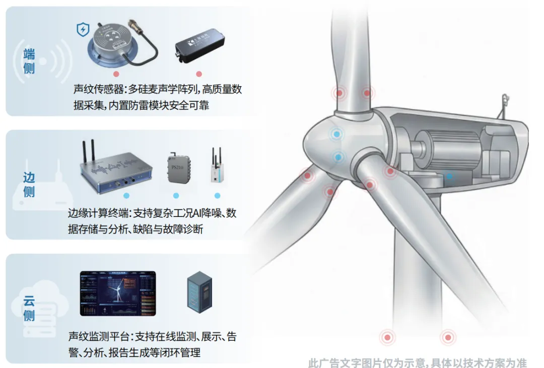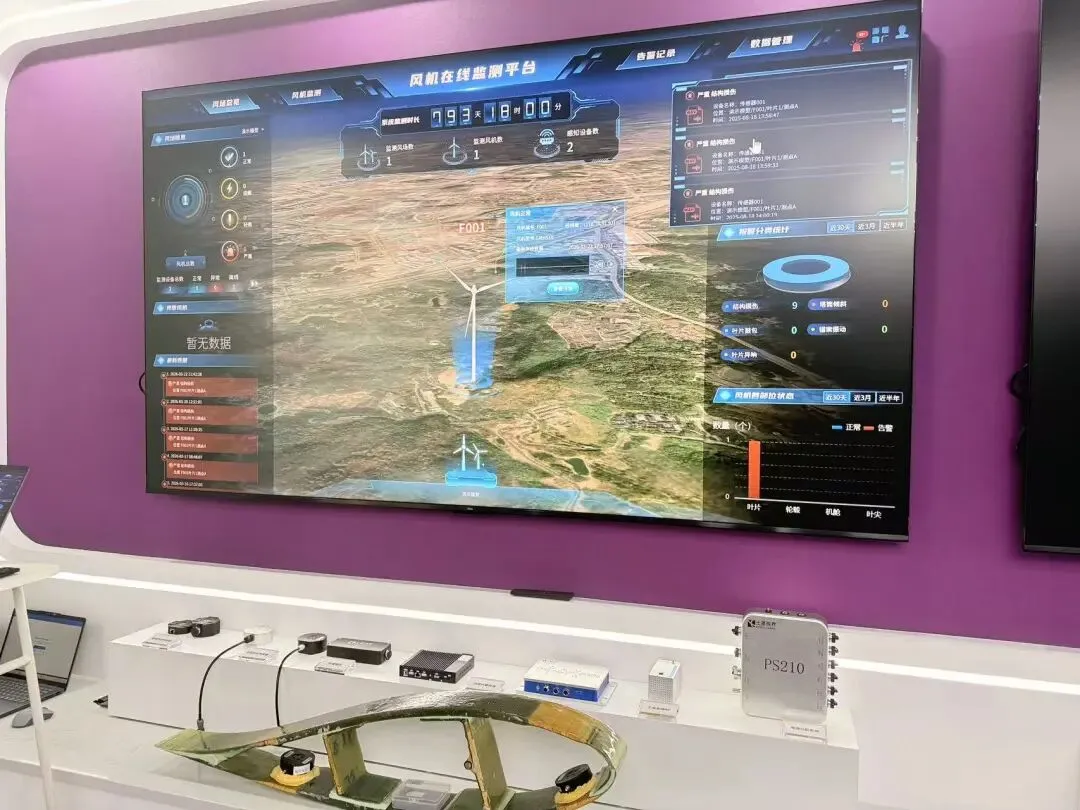 在公司的展厅里,一段缩小版的风机叶片模型上,几个黑色的声纹传感器正模拟着在真实风场中的工作状态。