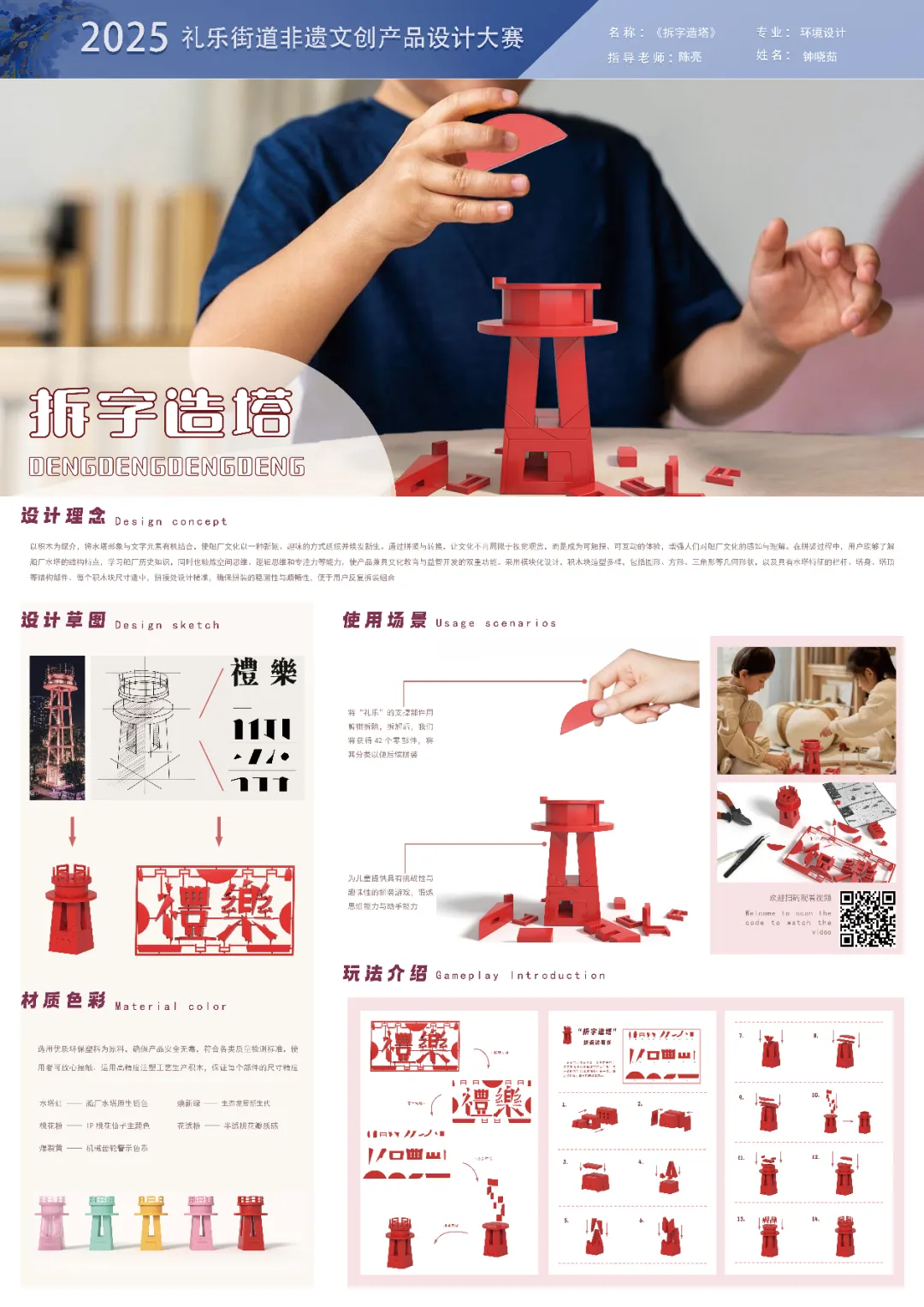 设计说明:以积木为媒介,将礼乐船厂水塔形象与文字元素有机结合,使船厂文化以一种新颖、趣味的方式延续并焕发新生,通过拼装与转换,让文化不再局限于视觉观赏,而是成为可触摸、可互动的体验,增强人们对的厂文化的感知与理解。在组装过程中,用户能多了解船厂水塔的结构特点,学习船厂历史知识,同时也锻炼空间思维、逻辑思维和专注力等能力,使产品兼具文化教育与益智开发的双重功能。