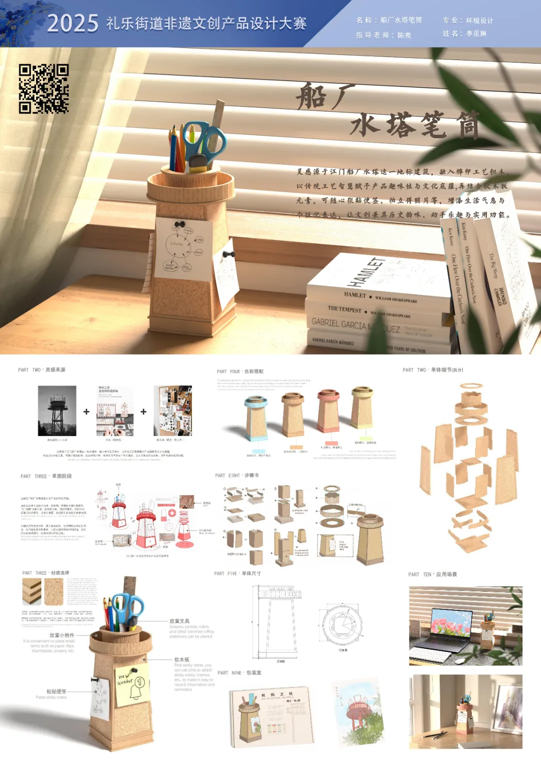 设计说明:灵感源于江门船厂水塔这一地标建筑,融入榫卯工艺积木,以传统工艺智慧赋予产品趣味性与文化底蕴,再结合软木板元素,可随心张贴便签、拍立得照片等,增添生活气息与个性化表达,让文创兼具历史韵味、动手乐趣与实用功能。