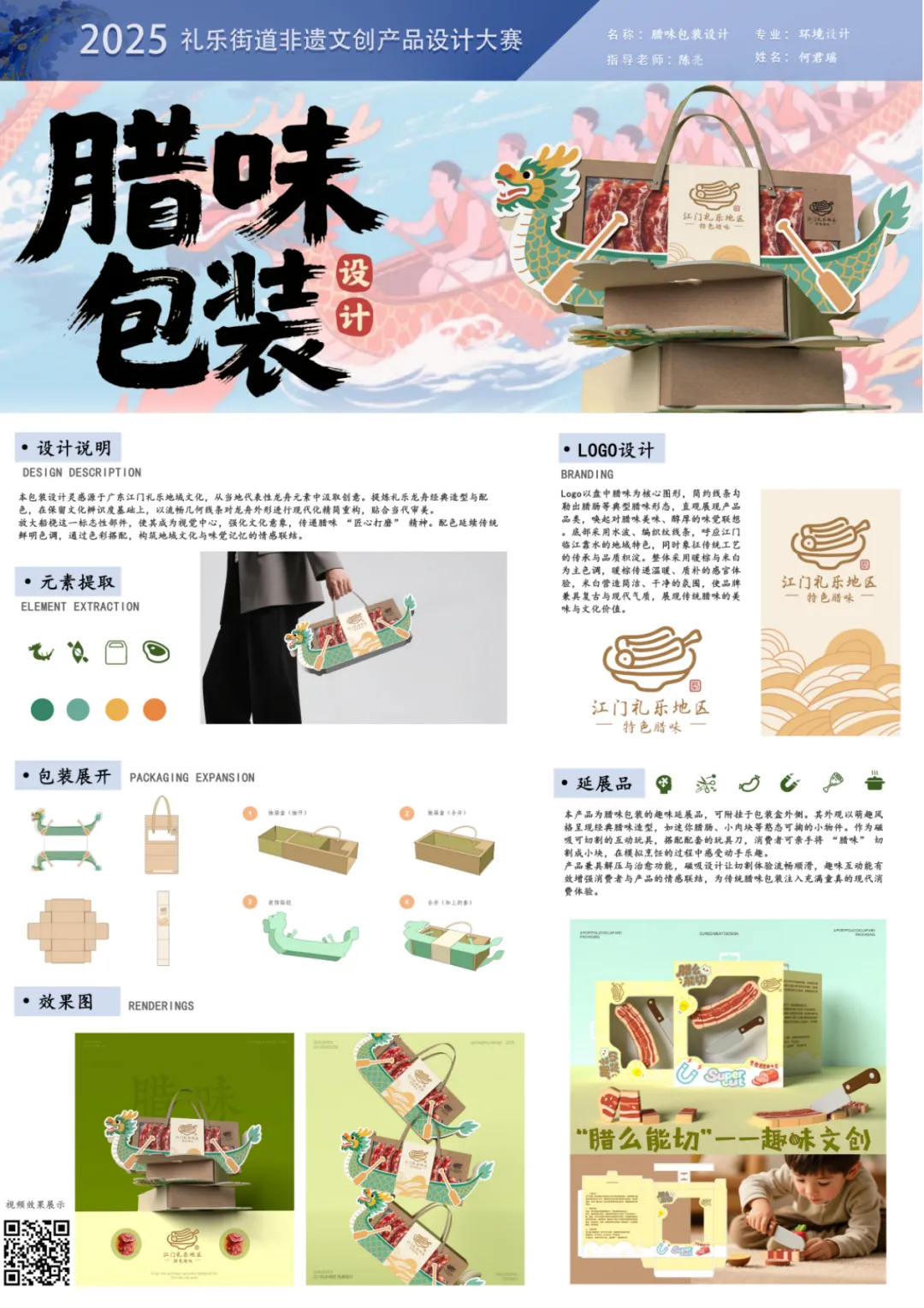 设计说明:本包装设计灵感源于广东江门礼乐地域文化,从当地代表性龙舟元素中汲取创意。提炼礼乐龙舟经典造型与配色,在保留文化辨识度基础上,以流畅几何线条对龙舟外形进行现代化精简重构,贴合当代审美。放大船桡这一标志性部件,使其成为视觉中心,强化文化意象,传递腊味“匠心打磨” 精神。配色延续传统鲜明色调,通过色彩搭配,构筑地域文化与味觉记忆的情感联结。