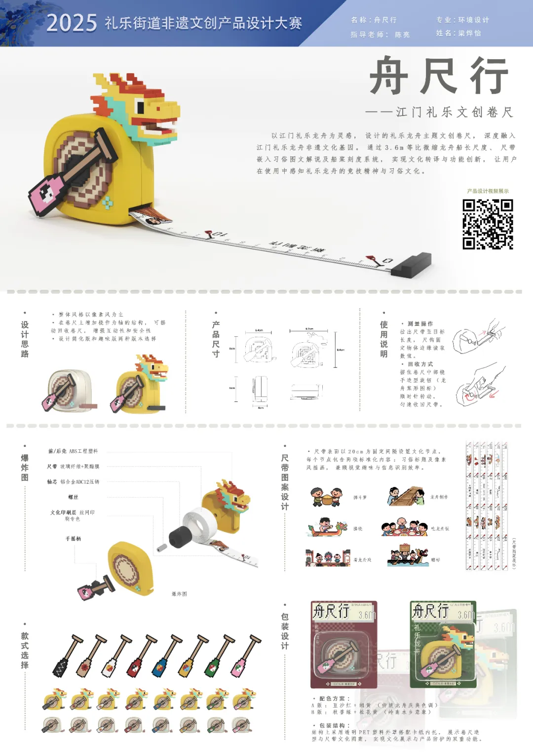 设计说明:以江门礼乐龙舟为灵感,设计的礼乐龙舟主题文创卷尺,深度融入江门礼乐龙舟非遗文化基因。通过3.6m等比微缩龙舟船长尺度、尺带嵌入习俗图文解说及船桨刻度系统,实现文化转译与功能创新,让用户在使用中感知礼乐龙舟的竞技精神与习俗文化。