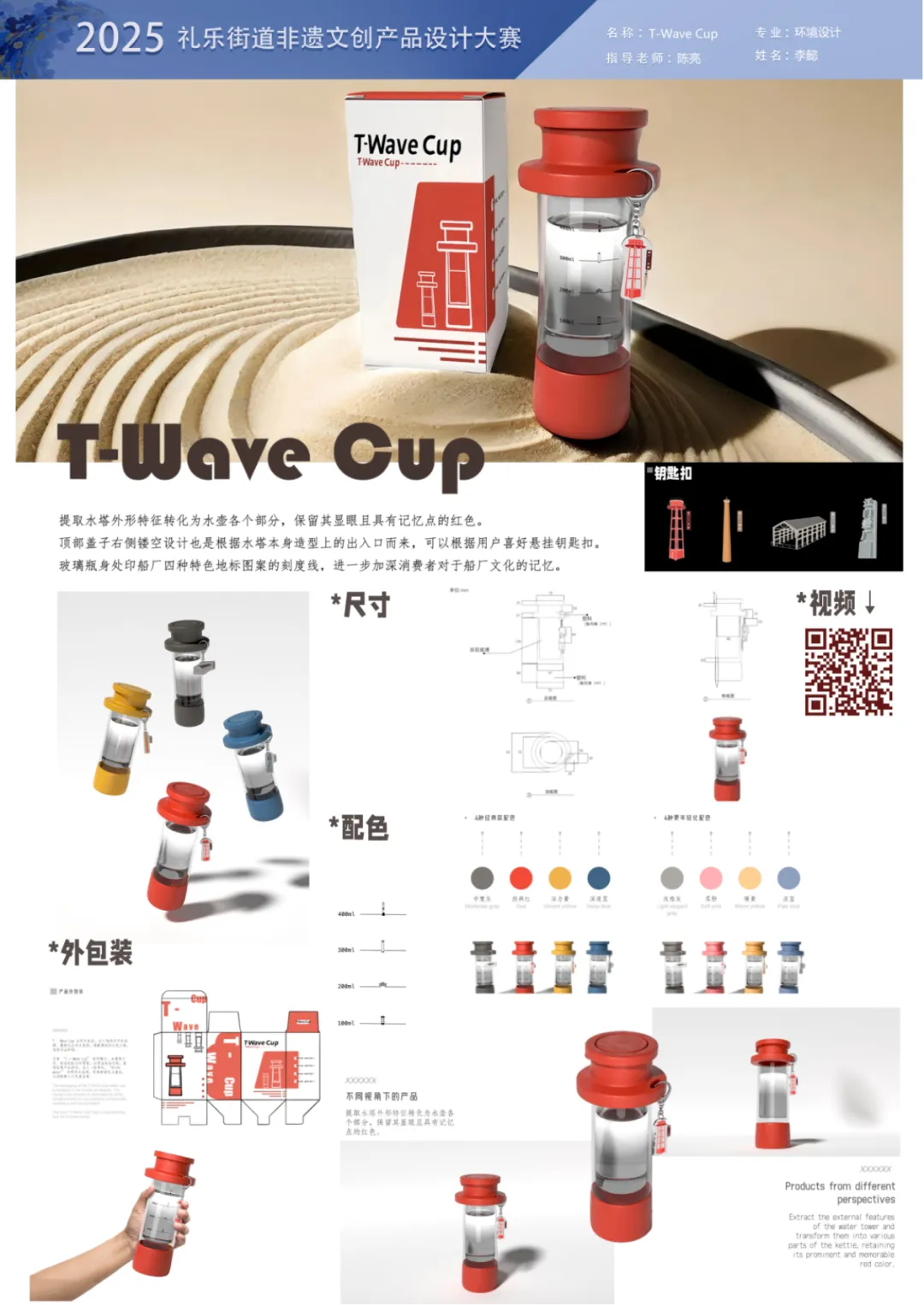 设计说明:提取水塔外形特征转化为水壶各个部分,保留其显眼且具有记忆点的红色。顶部盖子右侧镂空设计也是根据水塔本身造型上的出入口而来,可以根据用户喜好悬挂钥匙扣。玻璃瓶身处印船厂四种特色地标图案的刻度线,进一步加深消费者对于船厂文化的记忆。