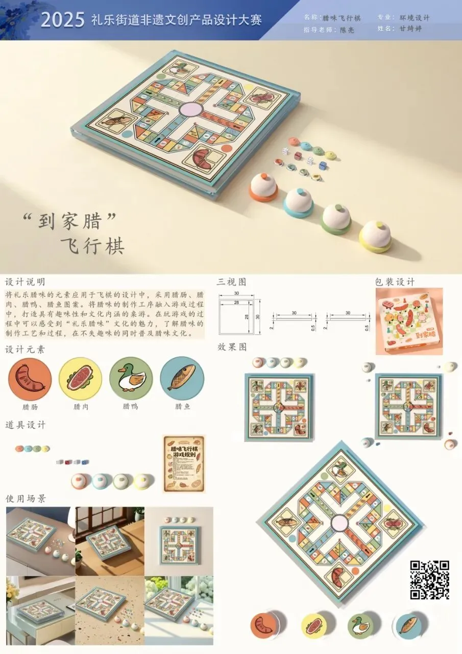 设计说明:将礼乐腊味的元素应用于飞棋的设计中,采用腊肠、腊肉、腊鸭、腊鱼图案。将腊味的制作工序融入游戏过程中,打造具有趣味性和文化内涵的桌游。在玩游戏的过程中可以感受到"礼乐腊味"文化的魅力,了解腊味的制作工艺和过程,在不失趣味的同时普及腊味文化。