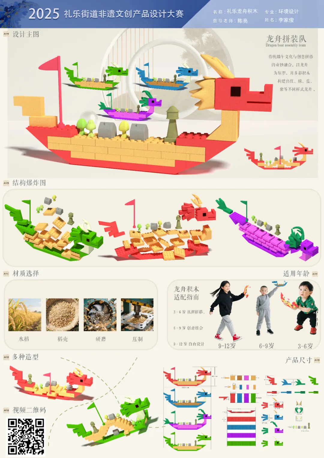 设计说明:传统端午文化与创意拼搭的奇妙融合。以龙舟为原型,用多彩积木构建出红绿蓝紫等不同样式龙舟。