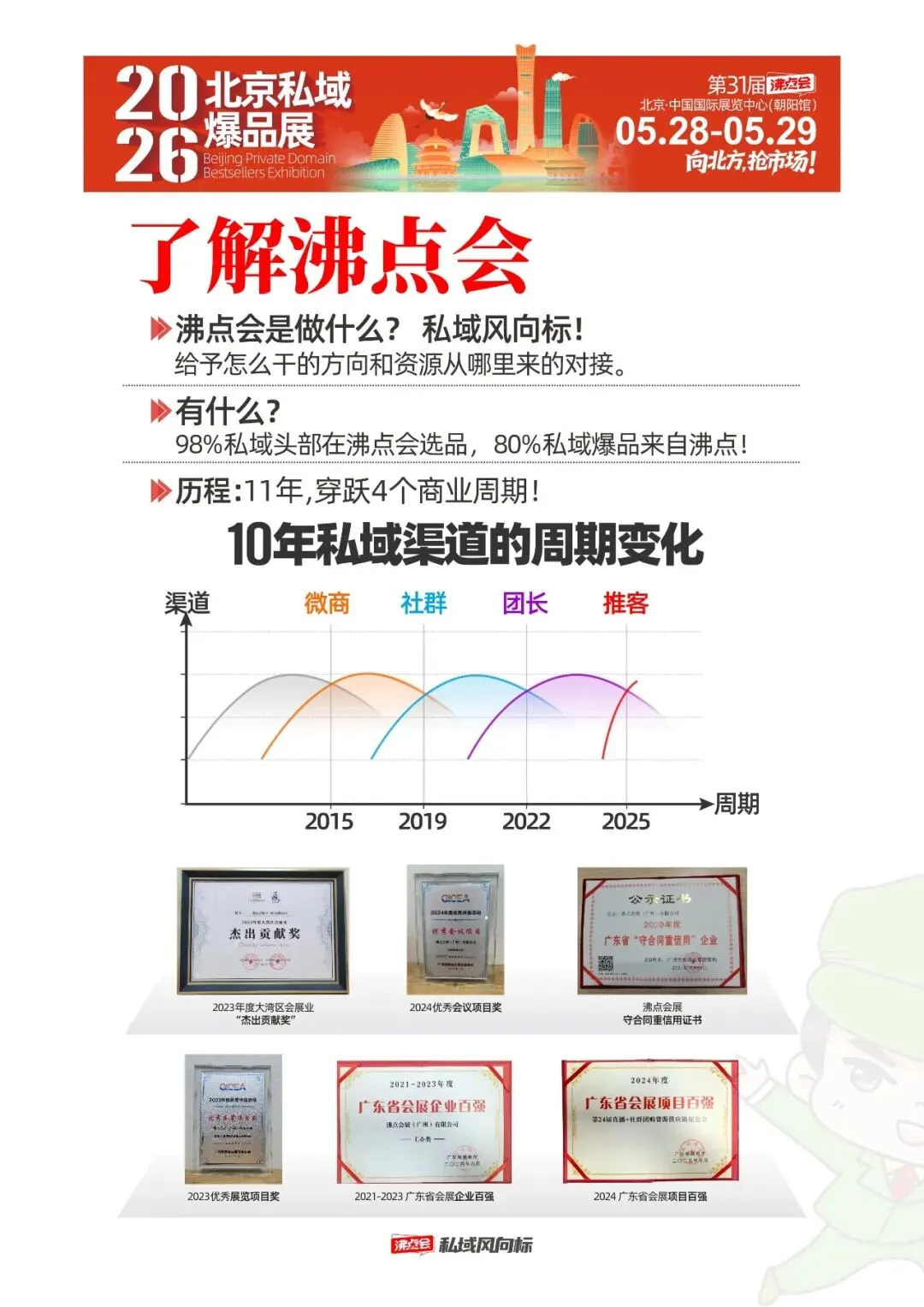 品牌方与渠道方时间精力有限,只选高效、高价值平台。沸点会 5 月北京、8 月广州南北私域爆品展,一场覆盖北方市场,一场深耕南方资源,两场参展,打通全国私域,省心又高效。
