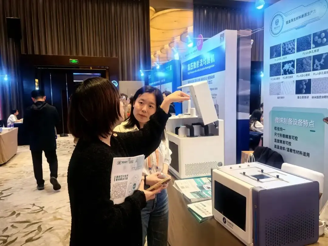 展会现场,霆科生物首次面向医美领域重点展示的高通量微球制备系统MSF-100成为展台焦点。该系统采用高精度多通道液滴芯片技术,集流体驱动、实时监测、粒径控制、高低温调节于一体,可高效制备均一性优异、结构可控的功能微球,广泛应用于再生材料微球、PLLA微球、功效原料微载体等领域,众多医美原料研发企业对该平台表现出浓厚兴趣。同时,首次向医美行业展示的微流控自动化产线整体解决方案同样收获热烈反响,该方案聚焦微球等产品从实验室样品到规模化量产的关键瓶颈,融合自动化装配、精密点样、在线检测等核心工序,多家参会企业对产线布局、产能设计及质量控制等表达了高度认可。
