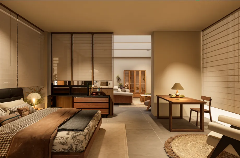 在超过400㎡的实木馆内,我们以空间为纸、木材为墨,挥毫书写了一部关于“天然、传承与匠心”的序章。展馆整体布局开阔大气,通过清晰的动线与错落有致的区块划分,呈现了一套套全场景化、风格统一的完整家居解决方案。