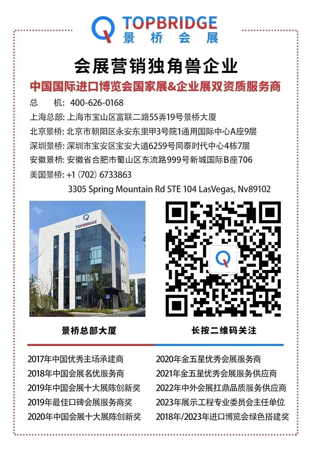 景桥会展集团TopBridge Expo Group是国际领先的集策划、设计、承建和运营管理为一体的全球会展营销服务商,集团通过了ISO9001:2015质量管理体系及ISO14001:2015环境管理体系认证。集团成立于2007年,总部位于上海,在北京、天津、广州、深圳、合肥、海南、成都、美国拥有实体公司,并在汉诺威、洛杉矶、迪拜、莫斯科及新加坡设立了办事处,领先品质,全球服务。