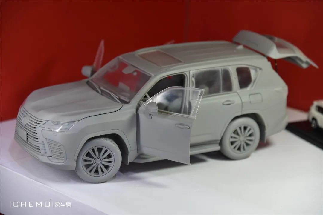 在 2023 HEC 中国国际模型博览会 LCD Model 力成达模型展台上展示的 LCD Model 1:18 合金全开工艺 Lexus LX 600 灰模样品 & 1:64 合金材质 Lexus LX 600 装饰板样品。