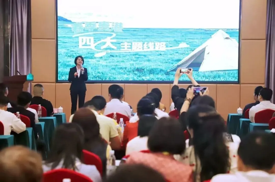 致辞完毕后,农卓松现场开展全方位推介,既细致讲解天上草原、桂平西山、北帝山、九凌湖足球训练基地等核心景区,以及全市4条精品体育旅游线路,也重点推介荷叶茶、金田淮山粉、桂圆干、扬翔肉肠等贵港特色美食,全方位展现城市体育旅游资源。她同时介绍,贵港拥有2200多年建城史,文化底蕴深厚、山水资源富集,是古代“海上丝绸之路”重要陆路起点,布山、骆越文化底蕴深厚;体旅资源具备鲜明差异化优势,是粤港澳大湾区游客休闲康养的理想后花园,诚邀各地客商、游客走进贵港,解锁体旅游玩新体验。