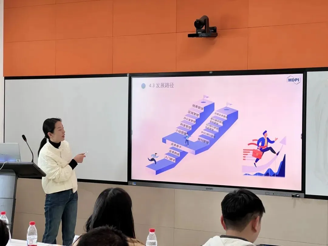 活动伊始,曼迪匹艾Water期刊出版专员刘泾泾以“人工智能与出版”为题展开分享。结合Water期刊在水资源领域的研究方向,她详细阐述了人工智能技术在学术出版中的应用场景,包括论文数据筛选、审稿效率提升、选题趋势预测等,结合MDPI旗下期刊的实践案例,展现了科技赋能学术出版的前沿趋势,为师生学术成果发表提供了新思路。