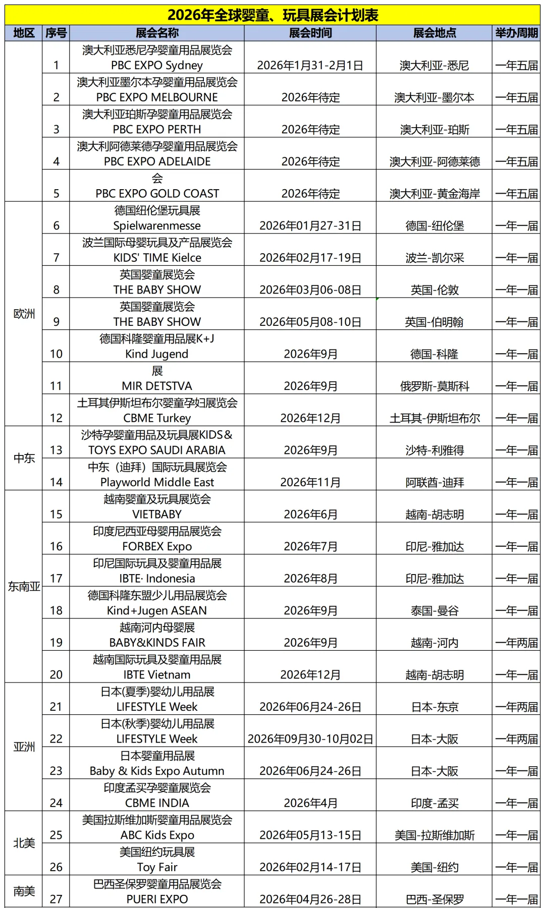2026年全球婴童、玩具展会计划表