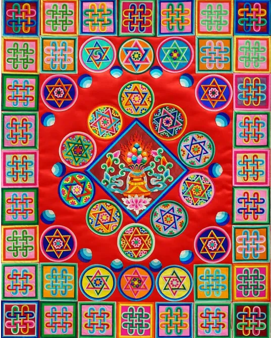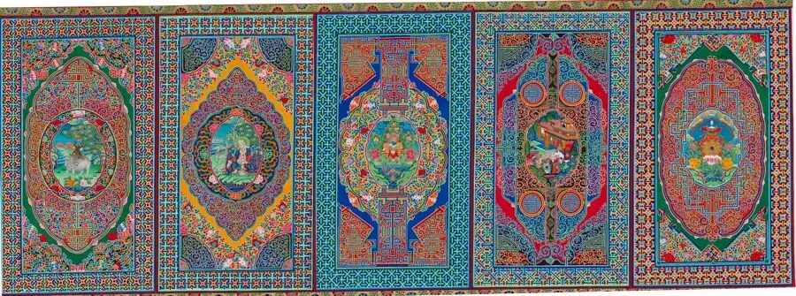 展览第一单元,观众能够近距离欣赏到《中国藏族文化艺术彩绘大观》(复制件)。作品原件由中国工艺美术大师宗者拉杰先生历时19年主持创作,长达数百米。第二单元集中展示《中国藏族文化艺术彩绘大观》下部中的彩绘、堆绣与书法唐卡精品。彩绘唐卡采用黄金、红珊瑚、绿松石等珍贵矿物颜料绘制,色彩绚丽,经久不衰。堆绣唐卡以绸缎、彩线、羊毛为材,经剪贴、拼缀、平敷、缝绣等工艺构制画面,兼具绘画的构图意境与刺绣的肌理质感,尽显藏族工艺美术的独特审美与精湛匠心。同时展出的还有藏文书法唐卡,让观众领略文字艺术的独特魅力,感受唐卡的丰富内涵和多元表达。“曼唐”是藏医学特有的医用教学挂图,“曼”意为医药,“唐”即唐卡卷轴画。最后一单元以这一专业教具及藏医工具实物为切入点,带领观众领略藏族传统医学的文化价值。
