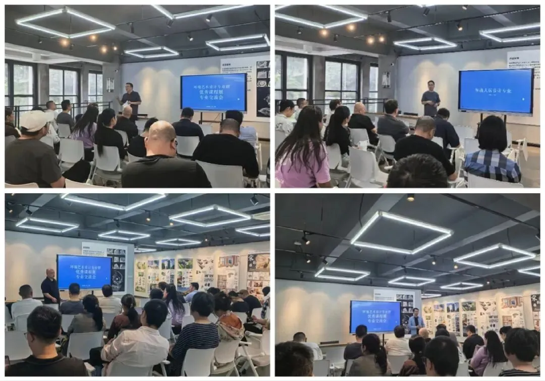 研讨会活动分三个环节:第一环节整体浏览,教师们逐一观摩各专业优秀课程作品;第二个环节按教研室分组讨论,任课教师介绍课程设计思路与教学实施情况,教师交流互动;第三个环节集中研讨,全体教师汇聚二楼会议区进行分享总结。