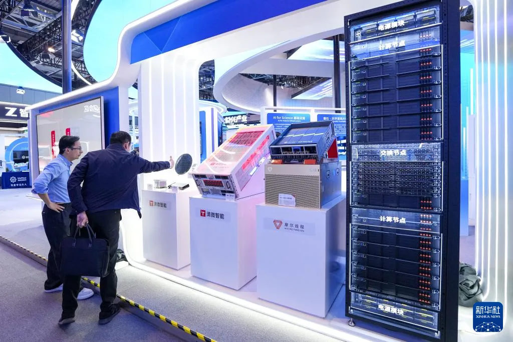 在中关村展示中心常设展上,参观者在“人工智能+”展区了解展出的AI芯片和服务器(3月25日摄)。