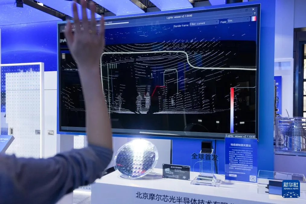 在中关村展示中心常设展上,一位工作人员在演示一款可用于自动驾驶与机器人的动态感知激光雷达(3月25日摄)。