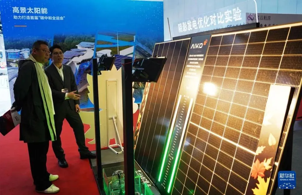 3月26日,工作人员向参观者介绍光伏发电的阴影发电优化对比实验。新华社记者 潘旭 摄